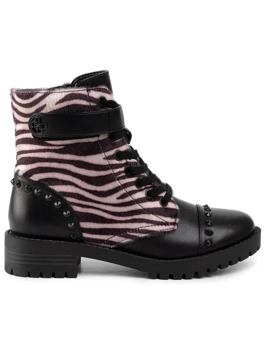 Stivaletti da donna con una combinazione audace di pelle nera e tessuto stampato a zebra rosa e nero. Questi stivali sono accentuati da borchie metalliche lungo il lato e una cintura regolabile con un grande logo rotondo, che aggiunge un tocco di design distintivo. La robusta suola dentellata offre una trazione eccellente, mentre il design alla caviglia li rende ideali per varie attività all'aperto. Perfetti per chi cerca un paio di scarpe che combinano funzionalità e stile audace, questi stivaletti sono una scelta eccellente per arricchire qualsiasi outfit con un elemento di tendenza.