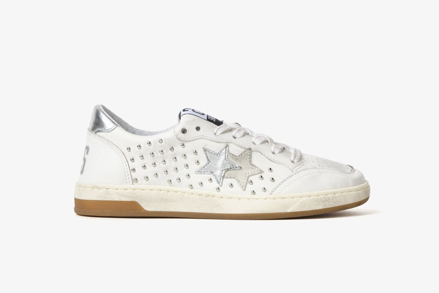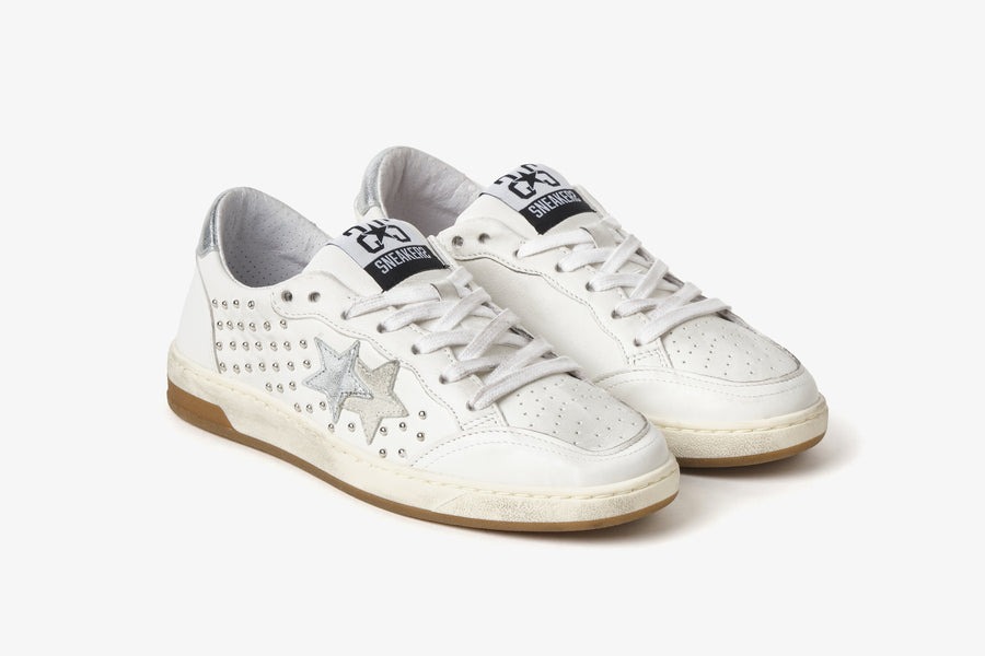Sneakers bianche in pelle di bovino effetto "used", con inserti argento e borchie a contrasto.