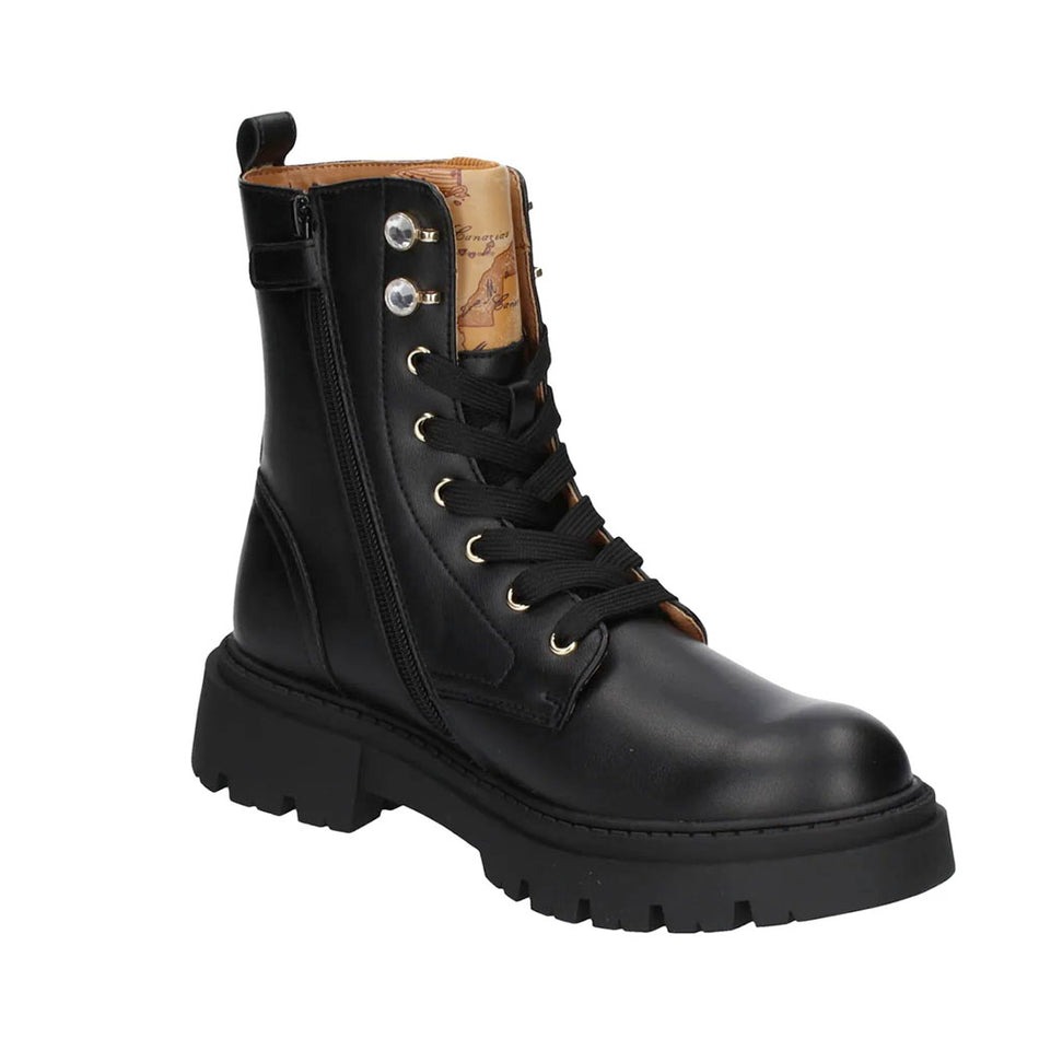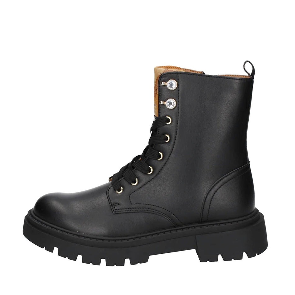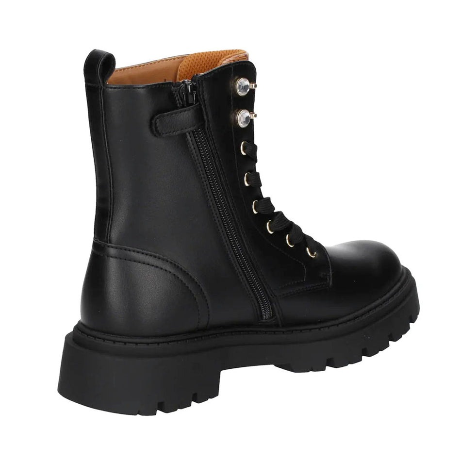 Anfibi in ecopelle nera con inserto sulla linguetta stampa Geo Classic. Applicazione gioiello. Zip interna che ne facilita la calzata. Suola in gomma h 3 cm