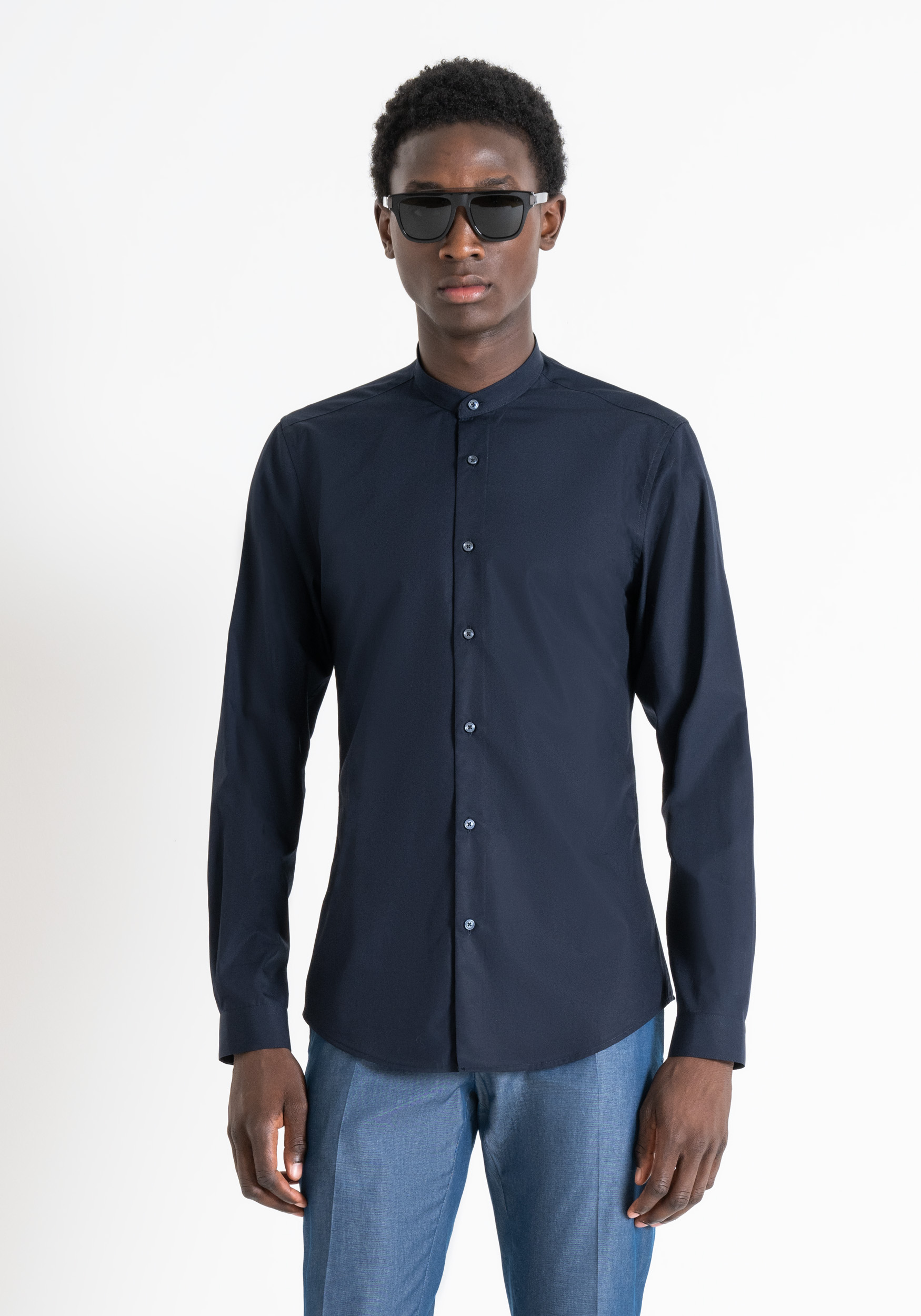 Veste aderente questa camicia griffata Antony Morato. Realizzata in morbido cotone soft touch easy iron, presenta un colletto alla coreana, abbottonatura a vista e polsini con due bottoni. Proposta in tinta unita, questa camicia saprà adattarsi con facilità al tuo guardaroba, sia casual che formale, in base agli abbinamenti.