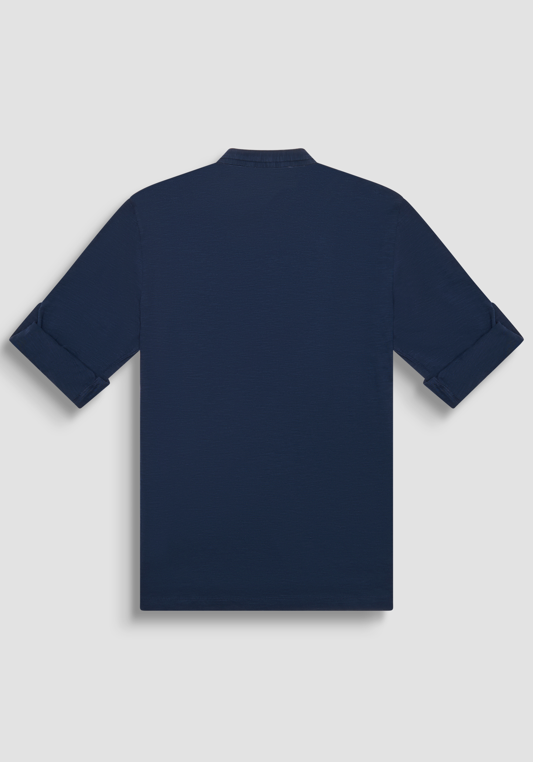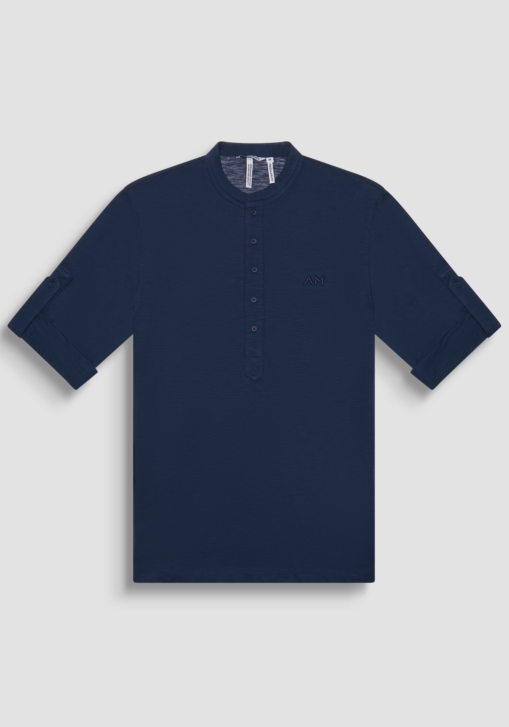 T-shirt stile serafino con collo alla coreana e maniche lunghe in morbido cotone fiammato, le maniche possono essere portate anche arrotolate, dettaglio che rende questa T-shirt molto versatile, chiusura con piccoli bottoni tono su tono e logo Antony Morato ricamato sul petto.