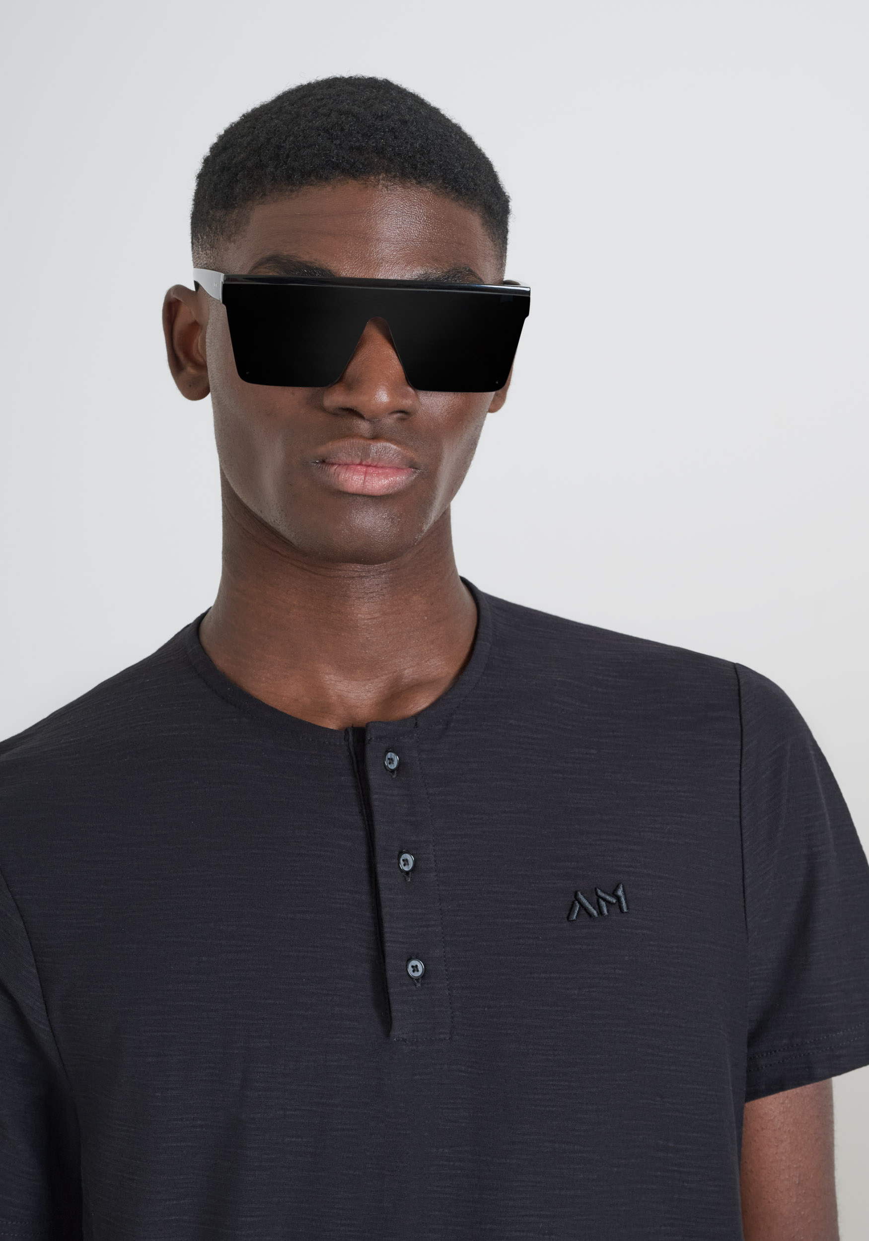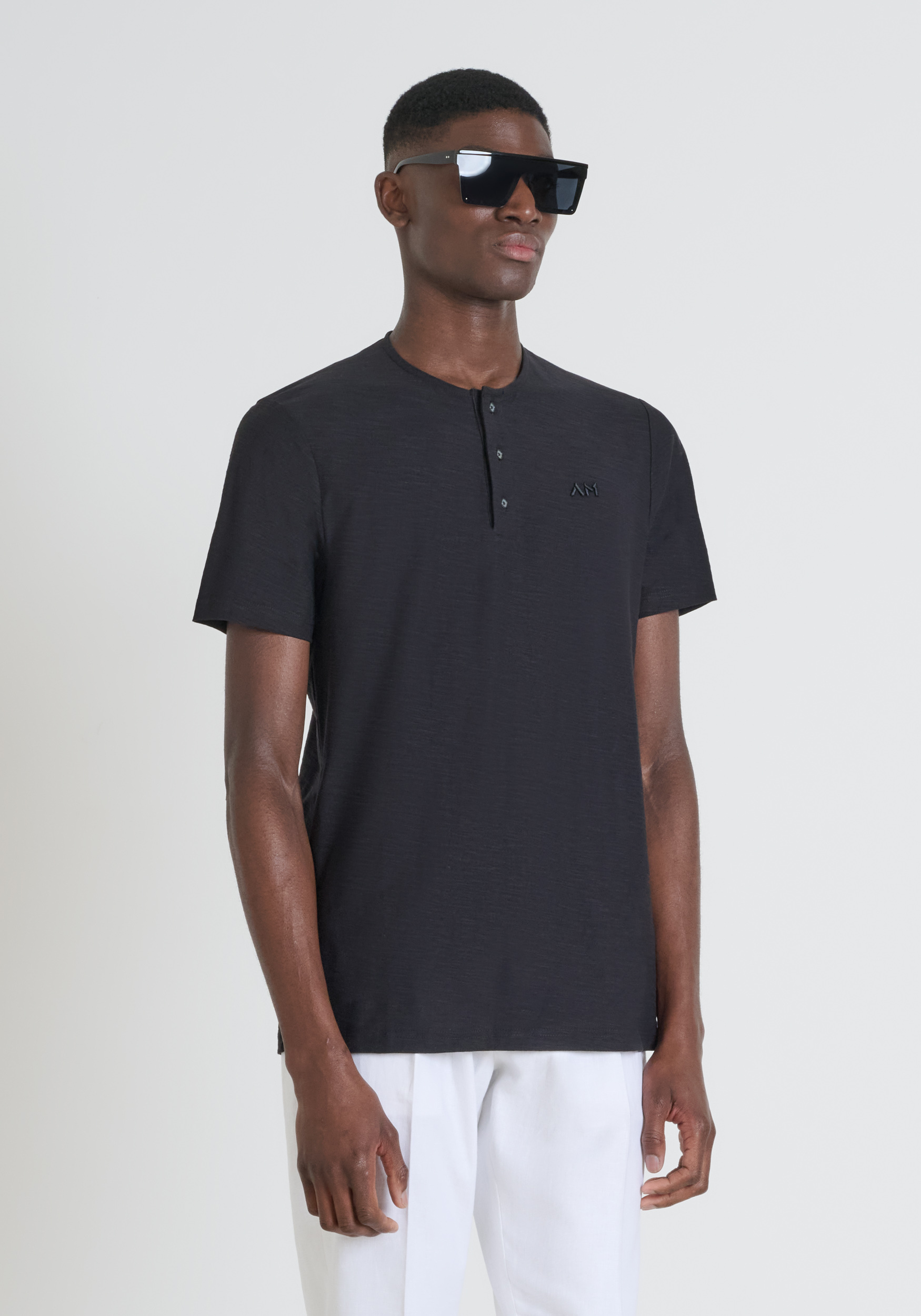 T-shirt girocollo in cotone fiammato dalla vestibilità regular fit. Chiusura a tre bottoni e logo cucito sul petto. Sceglila per i tuoi look casual negli irresistibili colori stagionali.