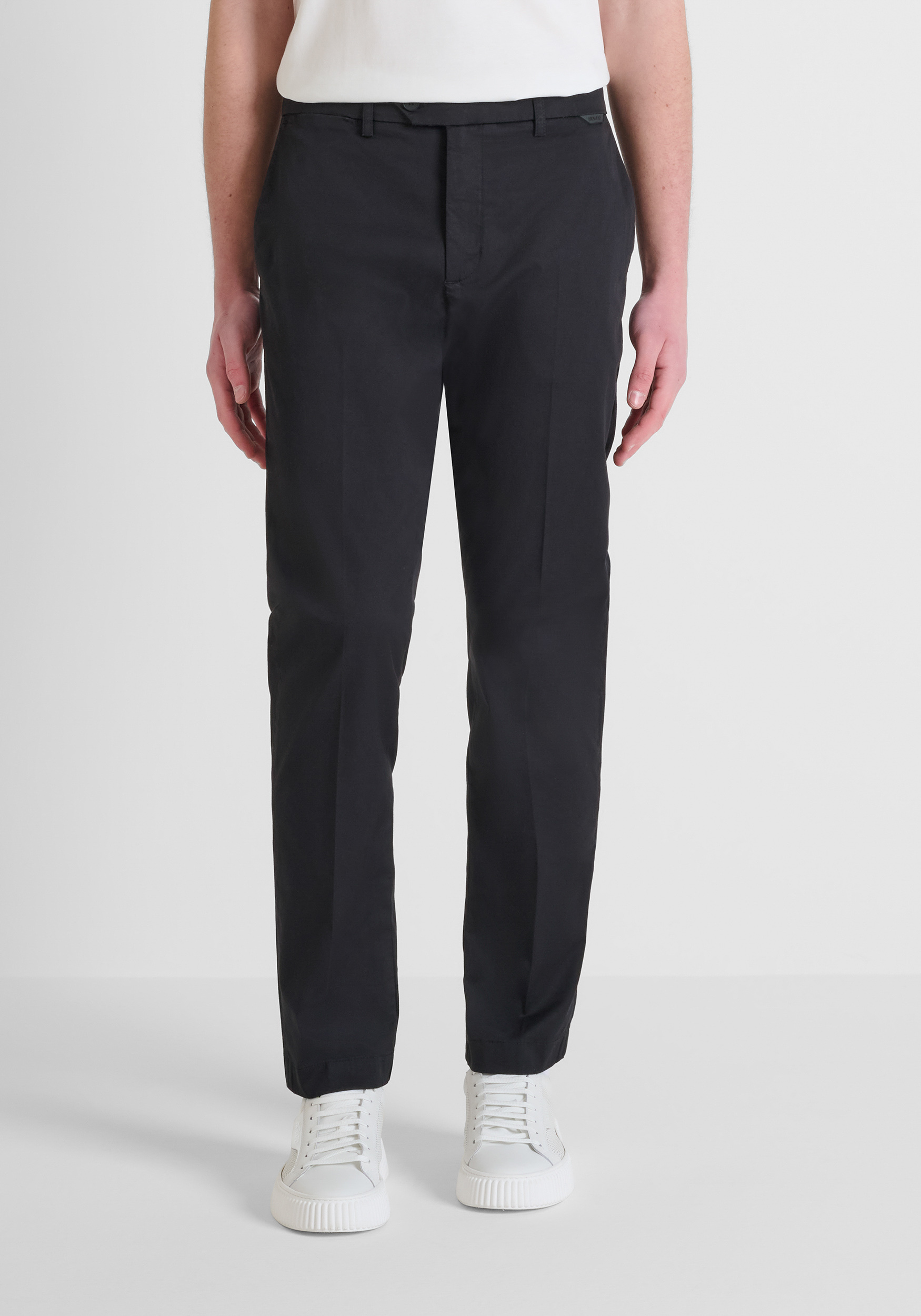 Con una vestibilità aderente, questi pantaloni firmati Antony Morato sono la scelta ideale per chi vuole mettere in risalto la figura. Confezionati in cotone elasticizzato, presentano quattro tasche, due allamericana e due a filetto con bottone sul retro. La chiusura è gestita da una zip nascosta e bottone asimmetrico. Una piccola placchetta logata sul davanti completa il modello.