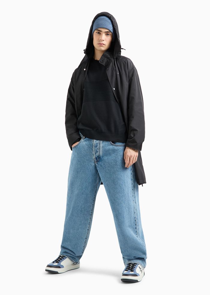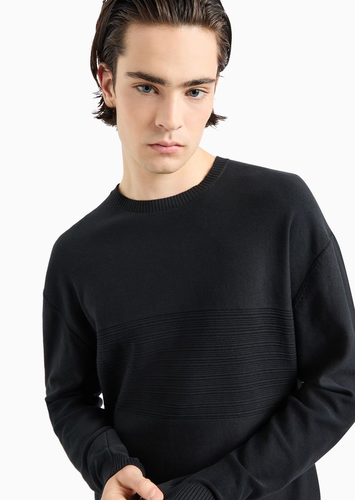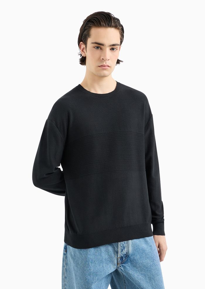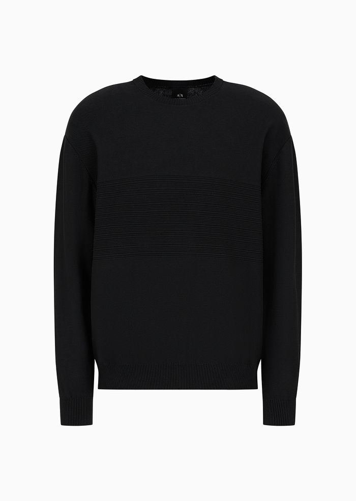 Maglione girocollo realizzato in cotone che presenta lavorazione a righe tono su tono nella parte centrale. Questo capo fa parte della selezione ASV perché il tessuto è realizzato con materiale sostenibile o riciclato certificato: un modello che unisce lo stile A|X con l'impegno del brand verso una sempre più alta attenzione.