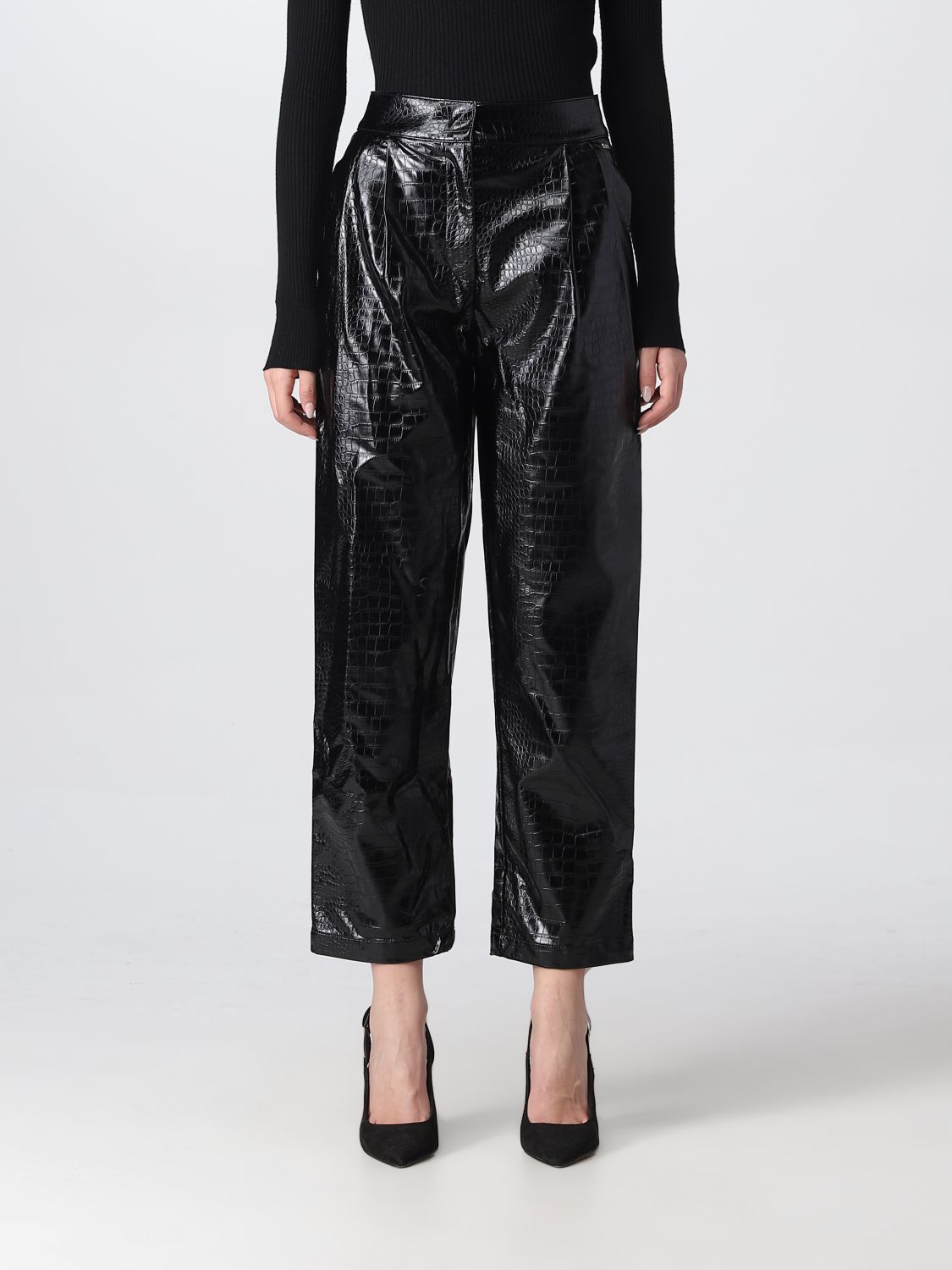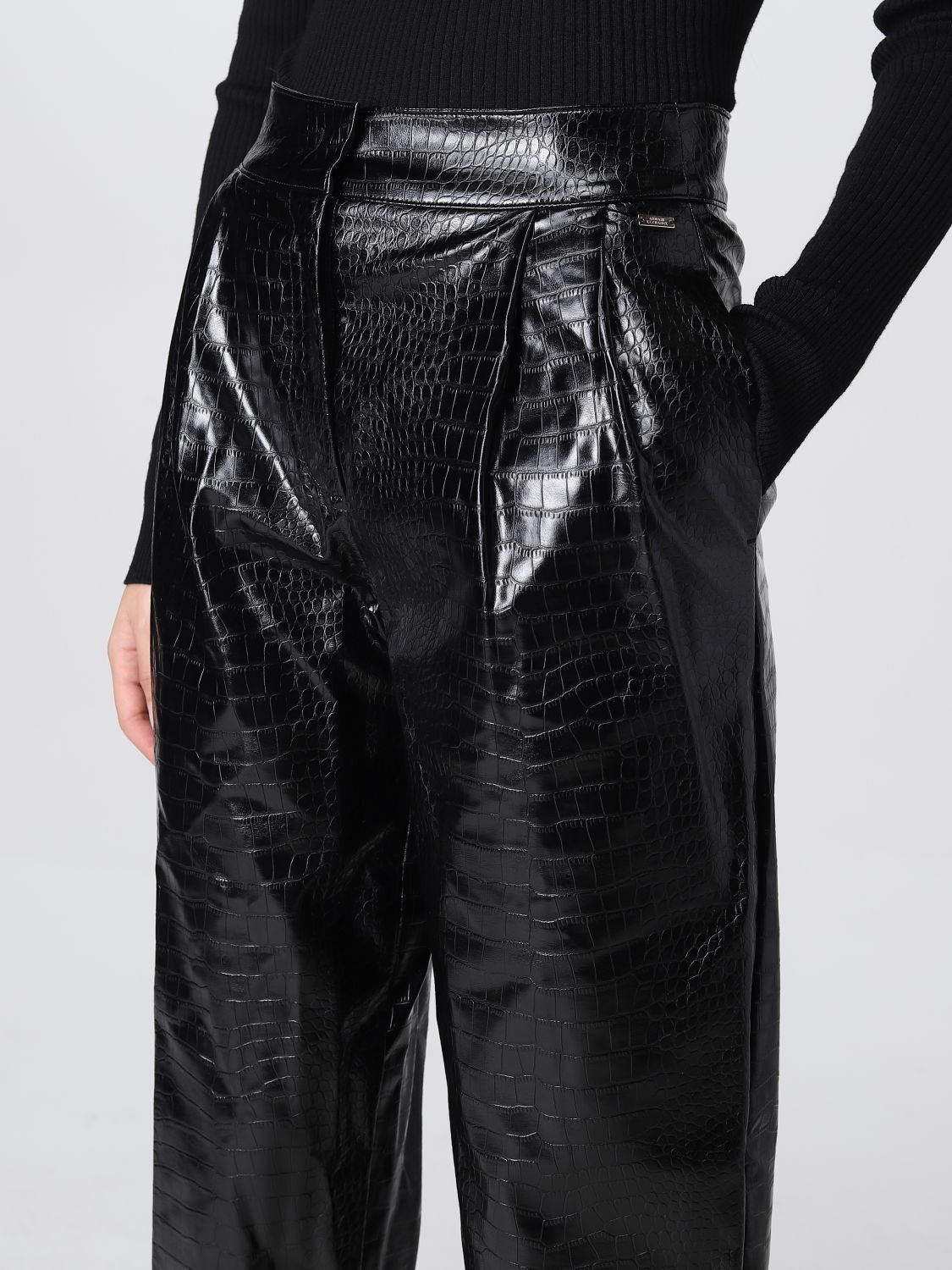 Strizzano l'occhio al massimalismo degli anni Ottanta i pantaloni in viscosa doppiata stampa cocco con finish lucido. Il modello, con pinces in vita e tasche laterali, è personalizzato dalla taghetta logo.