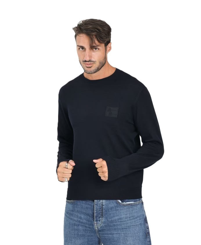 Realizzato in tessuto blu, questo maglioncino presenta un design pulito e una vestibilità regolare. Il collo, i polsini e il fondo a costine aggiungono un look curato e confortevole. Una discreta patch tono su tono con logo sulla parte sinistra del petto arricchisce il tocco moderno senza compromettere l'eleganza complessiva.