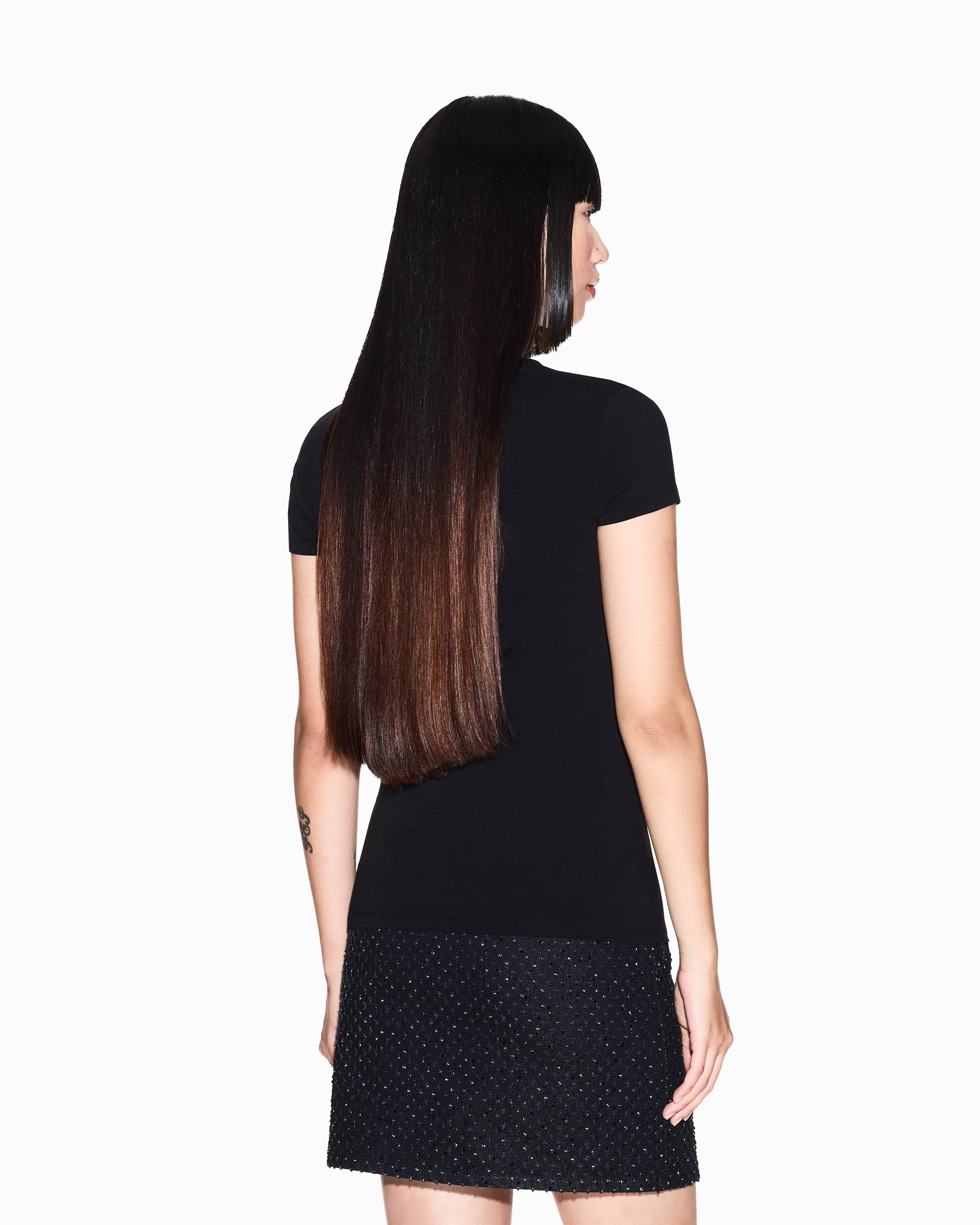 Un'ode alla semplicità sofisticata. Questa t-shirt slim fit incarna l'eleganza disinvolta. Realizzata in jersey di cotone stretch, accarezza il corpo con una vestibilità impeccabile. La sua silhouette pulita esalta la figura, mentre il tessuto morbido offre un comfort superiore. Perfetta da sola o come base per un look stratificato, questa t-shirt è un capo essenziale per un guardaroba moderno e versatile.