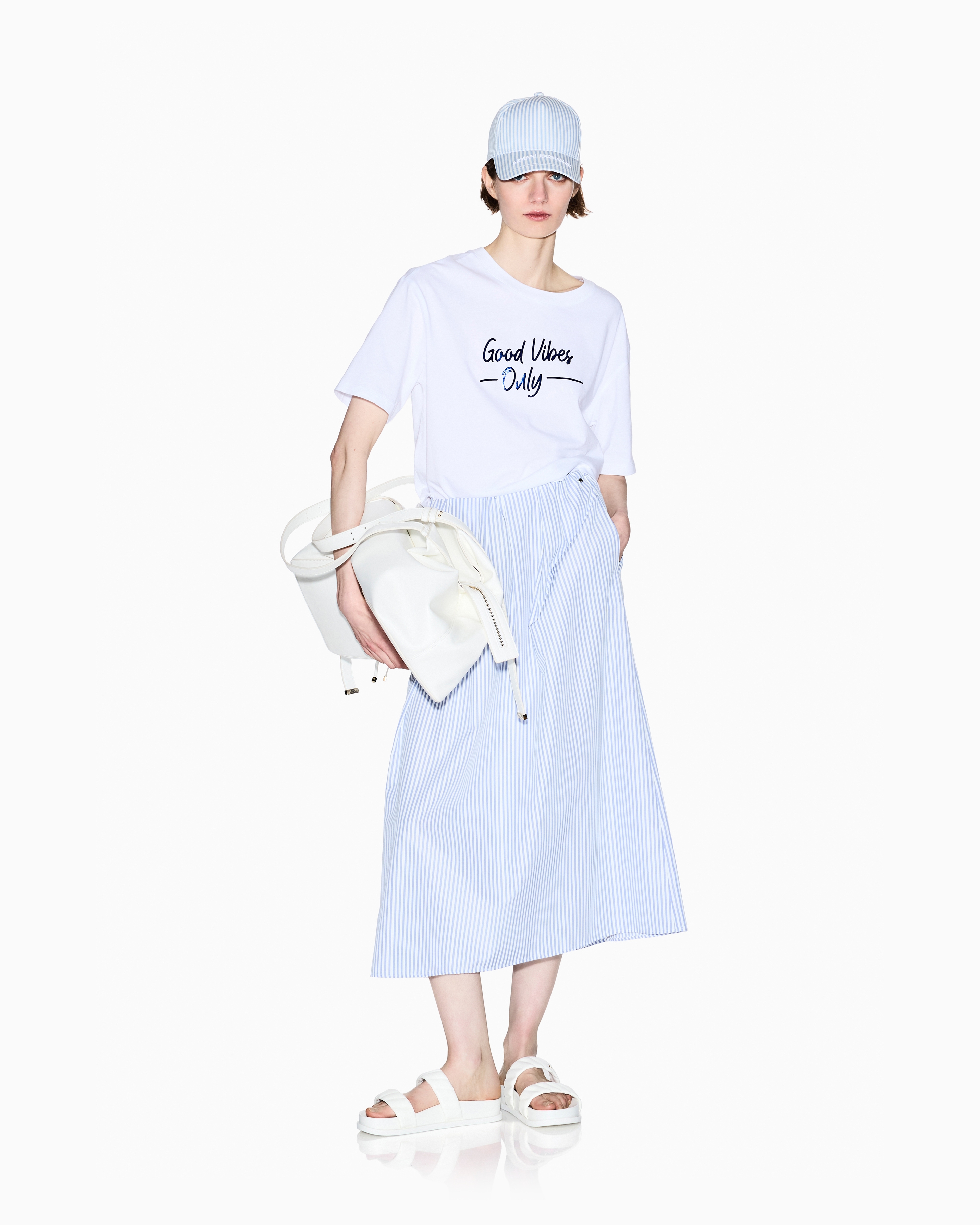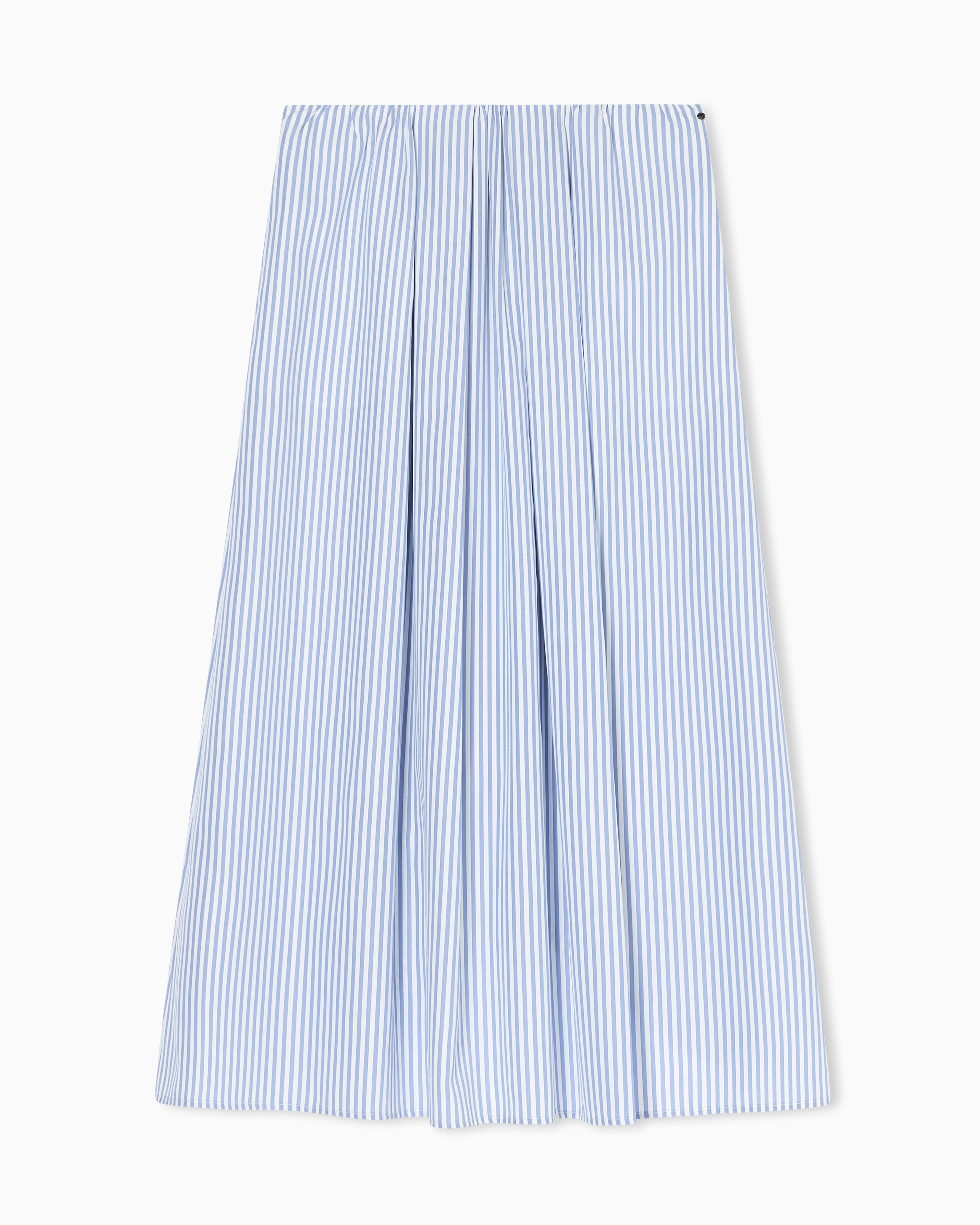Un'ode alla femminilità consapevole, questa gonna lunga accarezza la silhouette con un drappeggio fluido e sofisticato. Le righe verticali allungano la figura, mentre il tessuto riciclato racconta una storia di eleganza sostenibile. Perfetta per un'occasione speciale o per elevare il quotidiano, questa gonna è un investimento di stile senza tempo, un sussurro di lusso etico che danza ad ogni passo.