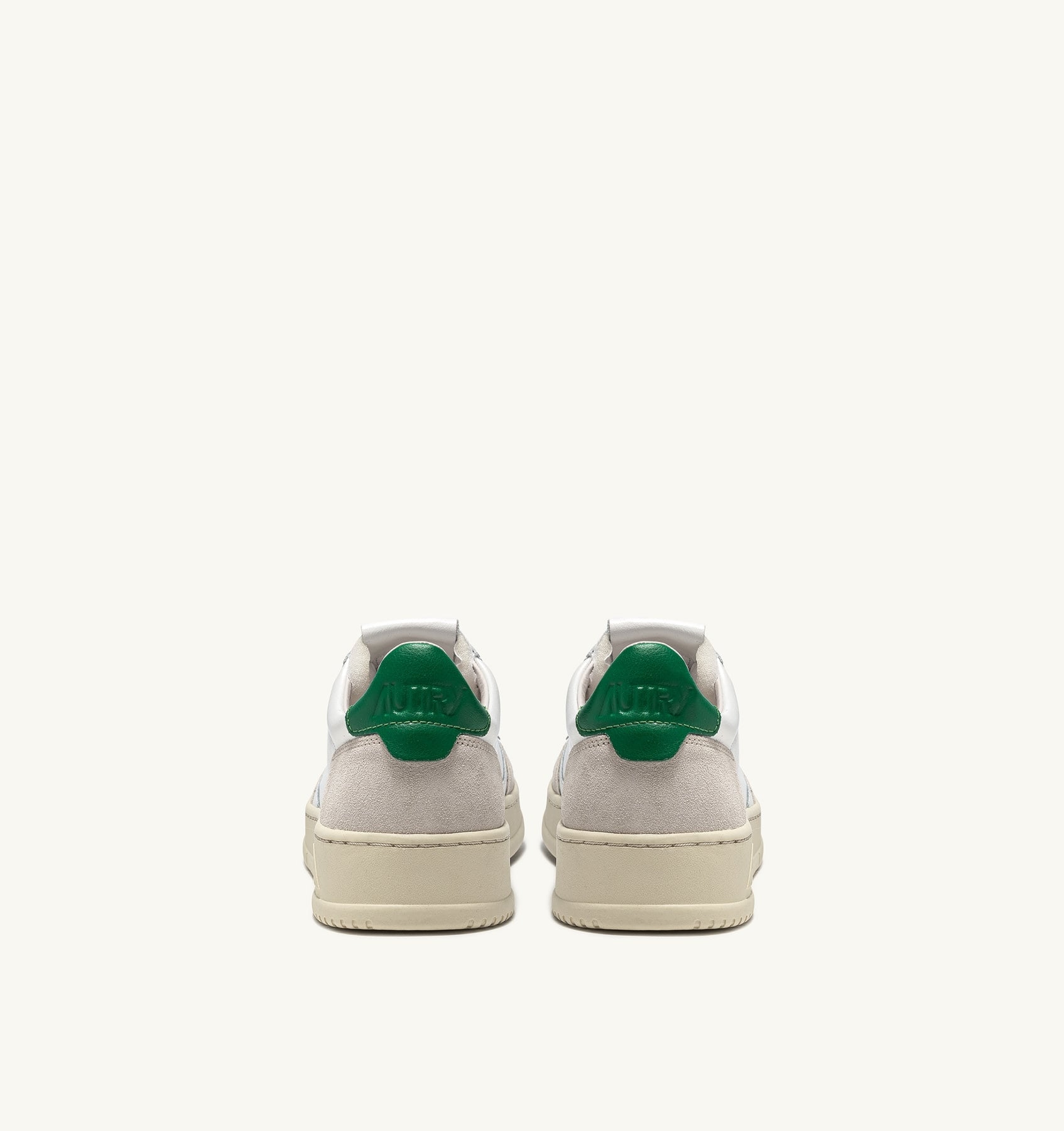 Questa sneaker da uomo è realizzata in morbida pelle bianca dall'aspetto autentico ed è rifinita con rinforzi in suede beige per un mix tattile e grafico deciso. Il dettaglio in pelle verde che decora il tallone è personalizzato con il logo Autry.