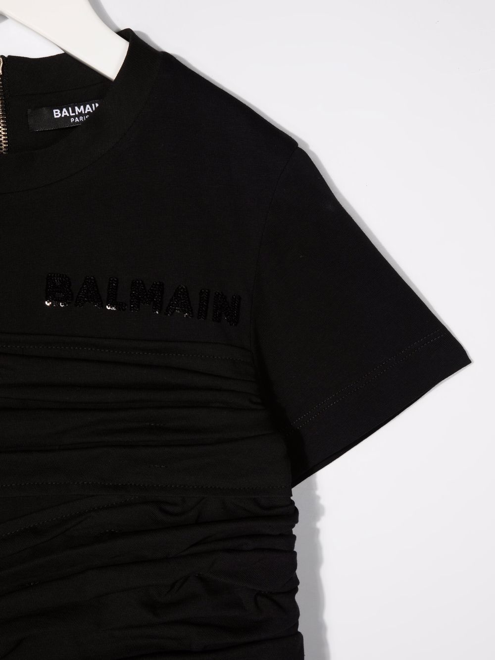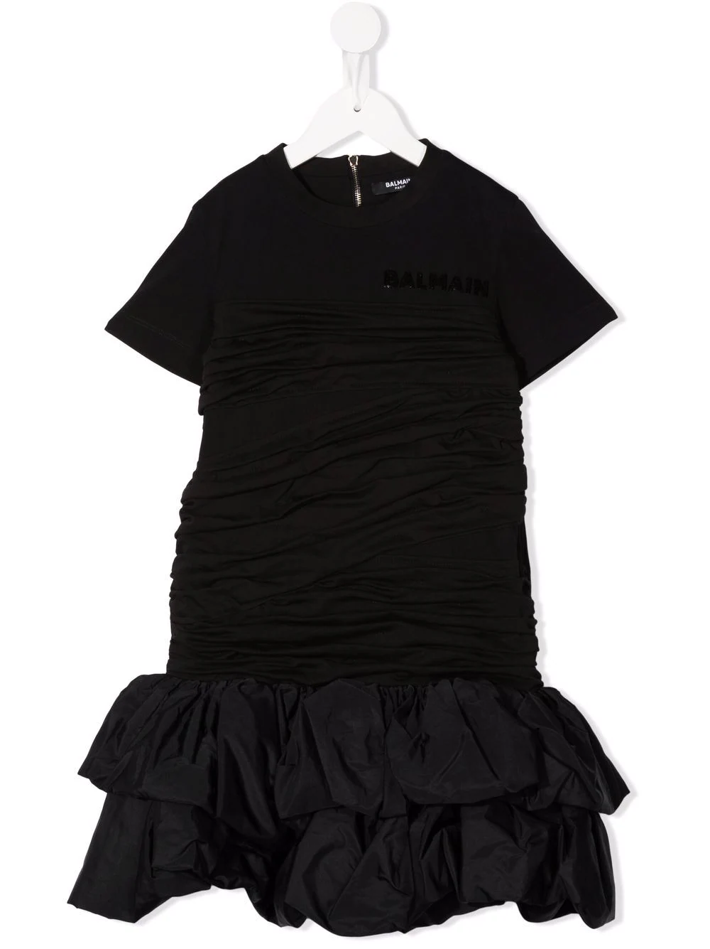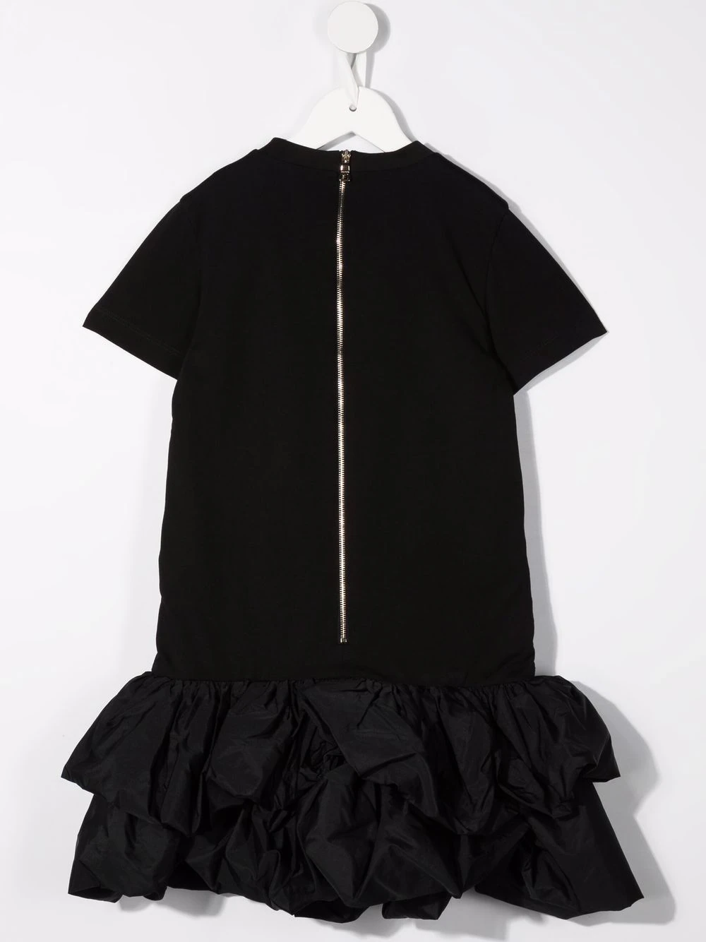 Abito midi con orlo a balzeDettaglio arricciato, scollo tondo, chiusura con zip sul retro, maniche corte e fondo con balza. Materiale: cotone.