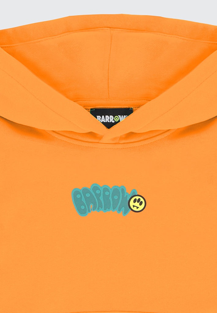 Felpa unisex in felpa di cotone con cappuccio e vestibilità regular. Il modello presenta cappuccio strutturato e tasca a marsupio frontale, mentre polsi e fondo sono rifiniti con lavorazione a coste per assicurare stabilità e definizione del fit. Sul fronte è applicata la grafica Barrow in stile bubble con smiley integrata, mentre sul retro il maxi logo occupa gran parte della superficie, garantendo una forte riconoscibilità visiva. Una smiley di dimensioni maggiorate decora inoltre il cappuccio, aggiungendo un elemento distintivo nella vista laterale e posteriore. Una proposta completa che unisce costruzione funzionale e impatto grafico, ideale per rinnovare il guardaroba kids con un approccio deciso e contemporaneo.