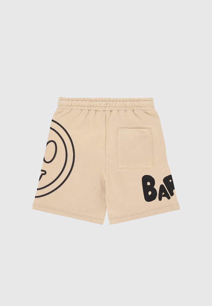 Il modello presenta vita elasticizzata con coulisse interna regolabile e laccetti a contrasto. La superficie del capo è caratterizzata da una stampa grafica di grandi dimensioni: il logo Barrow è posizionato su una gamba, mentre la smiley iconica occupa parte dell'altra gamba e continua sul retro in un motivo avvolgente. Una tasca applicata sul retro completa la struttura del modello. Una soluzione pratica e dal forte impatto visivo, progettata per aggiungere personalità e riconoscibilità ai look kids in chiave streetwear.