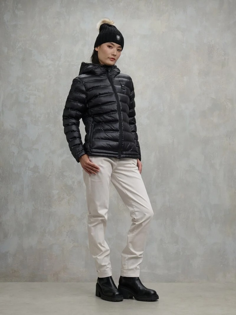 Giubbetto con cuciture nastrate a righe orizzontale. Capo con imbottitura leggera ed ecologica, con due cuciture lungo i lati per un effetto sfiancato.