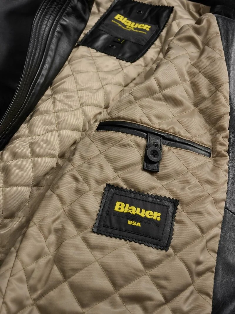 Bomber in pelle leggermente imbottito. Maglia a costine elasticizzate sullinterno collo, sui polsini e sul fondo del capo per farlo aderire alla figura