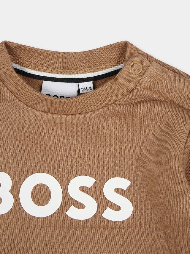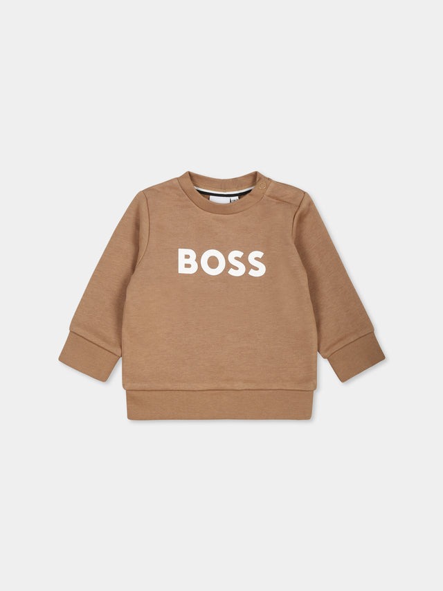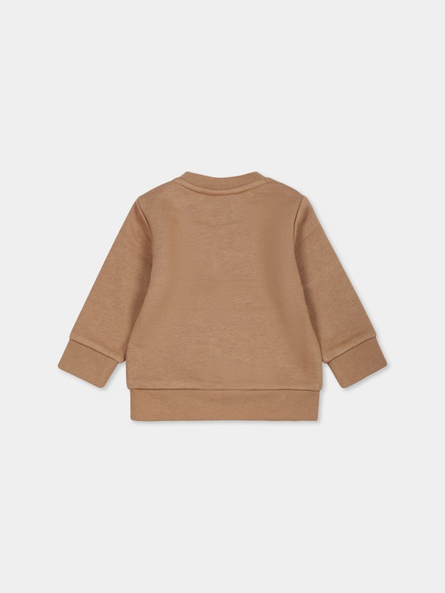 Felpa beige in misto cotone felpato, a maniche lunghe, con girocollo a costine, chiusura con bottoni automatici sulla spalla, polsini e orlo a costine. È decorata con stampa logo frontale.