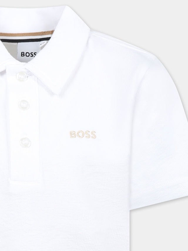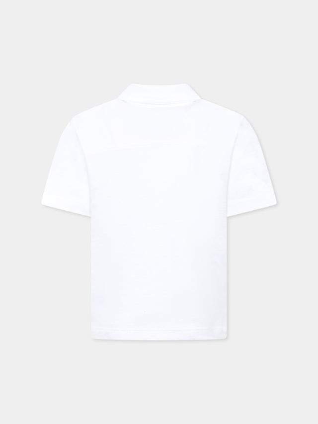 Polo bianca in cotone, a maniche corte, con colletto a punta e chiusura frontale con bottoni. È decorata con logo ricamato sul petto.