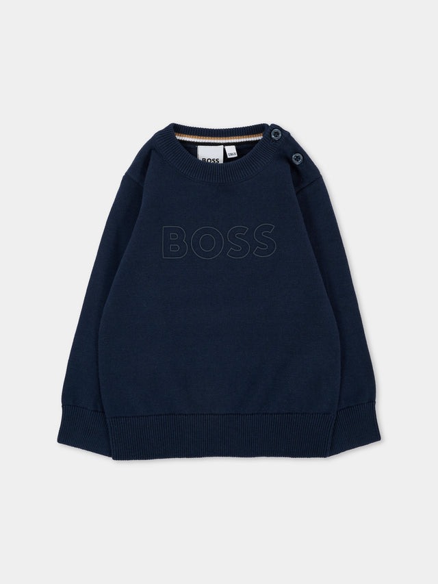 Maglione blu realizzato in cotone, con maniche lunghe, girocollo, orlo e polsini a costine e chiusura con bottoni sulla spalla. È decorato con logo gommato sulla parte anteriore.