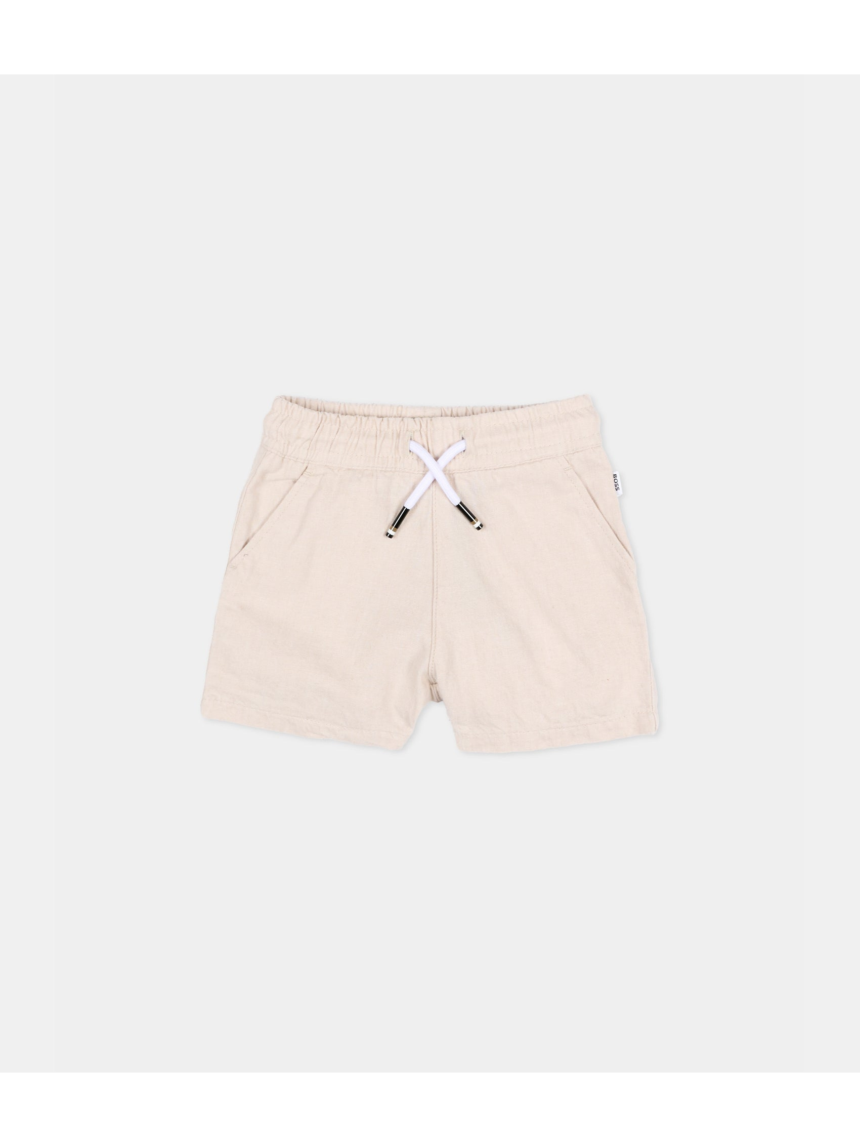Shorts casual in morbido tessuto misto cotone-lino firmati BOSS in una tonalità beige neutro, con elastico in vita e pratica coulisse bianca con terminali in metallo. Le tasche oblique sul davanti aggiungono funzionalità quotidiana, mentre la tasca applicata sul retro è rifinita con il logo BOSS ricamato in bianco. Linea essenziale e pulita che esalta il volume corto e leggero del modello.