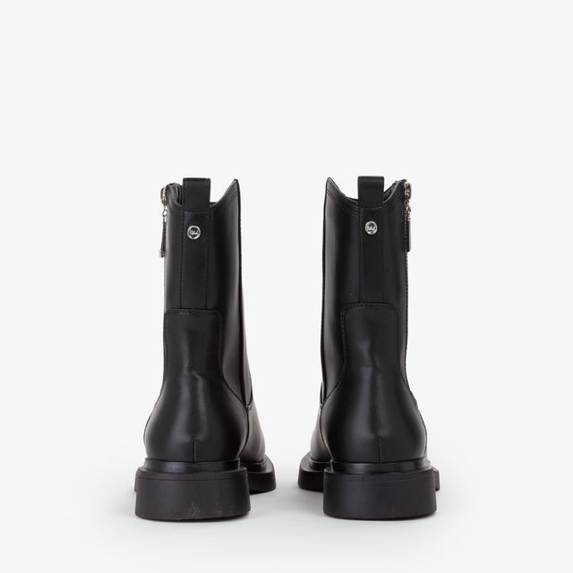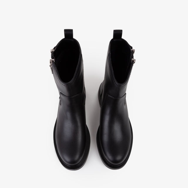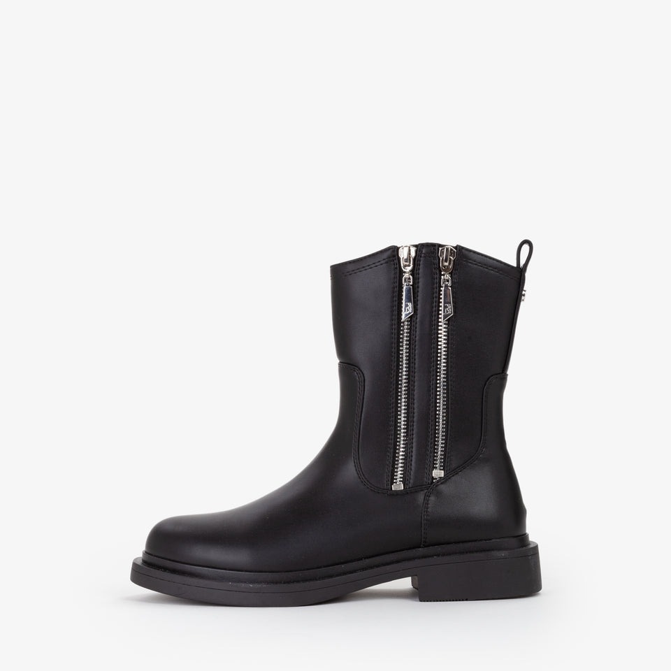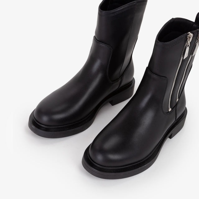 Anfibio con doppia zip laterale metallica. Il design minimal ma grintoso lo rende estremamente versatile: perfetto per look casual con jeans e maglione oversize, ma anche per spezzare outfit più femminili come abiti midi o gonne in pelle. Ideale nelle giornate fredde per uno stile urbano deciso e confortevole.