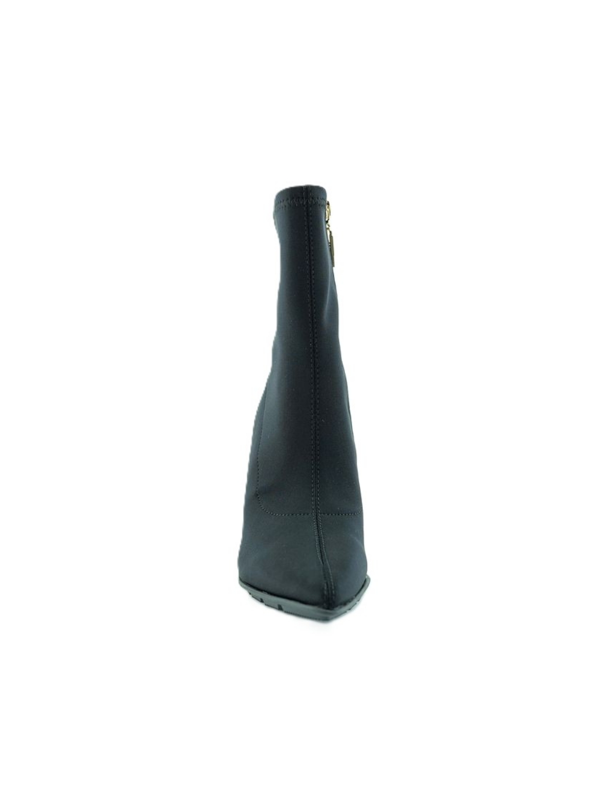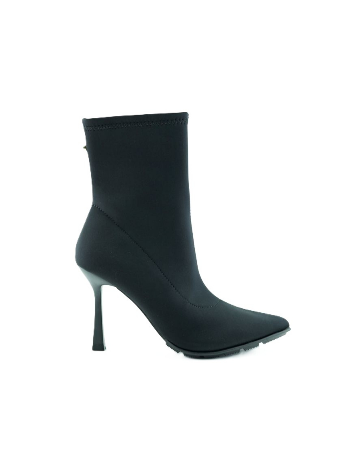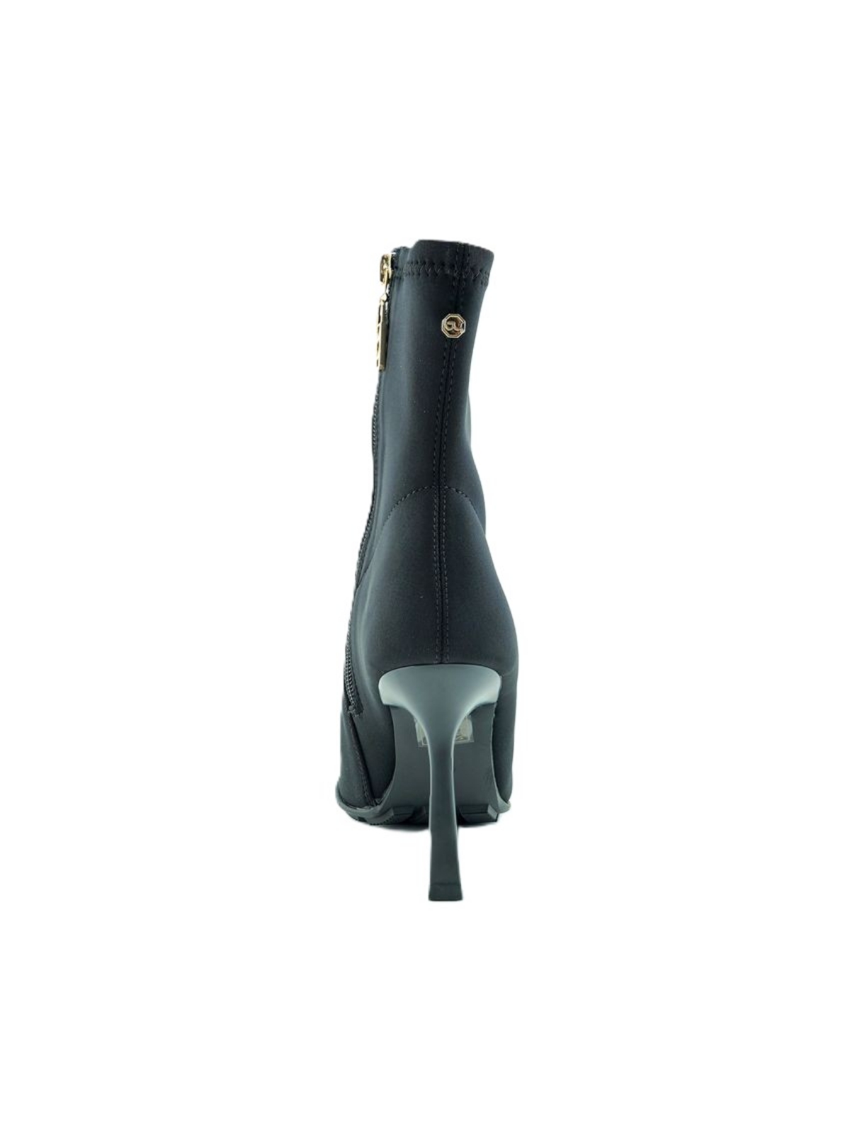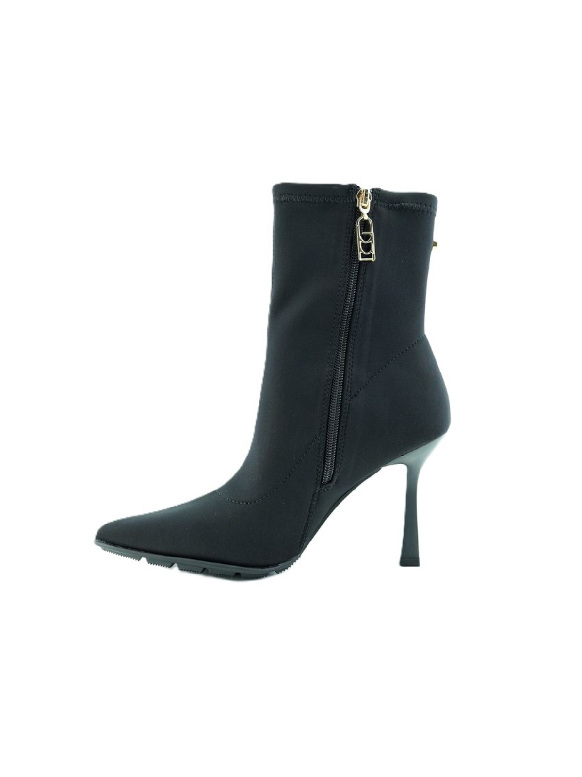 Tronchetto nero in tessuto. Tacco sottile. Chiusura laterale con zip.