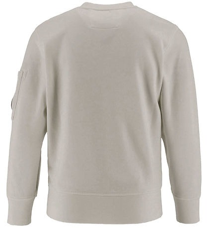 Felpa bianca in cotone felpato, a maniche lunghe, con girocollo, polsini e orlo a costine e tasca con botttone sulla manica. È decorata con lente applicata su una manica.