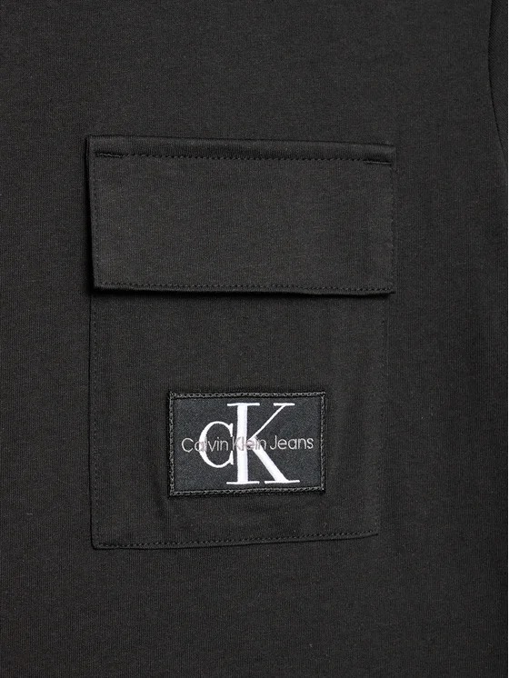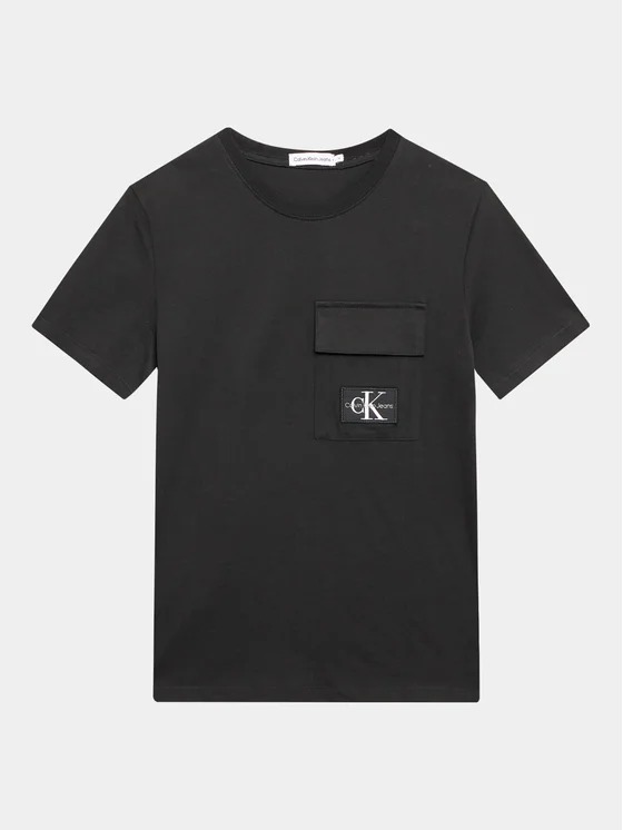 T-shirt Calvin Klein da bambino a tinta unita in colorazione nero con taschino sul petto e classica toppa del brand cucito all'interno. Modello girocollo, maniche corte, fondo con orlo dritto e tessuto in cotone.