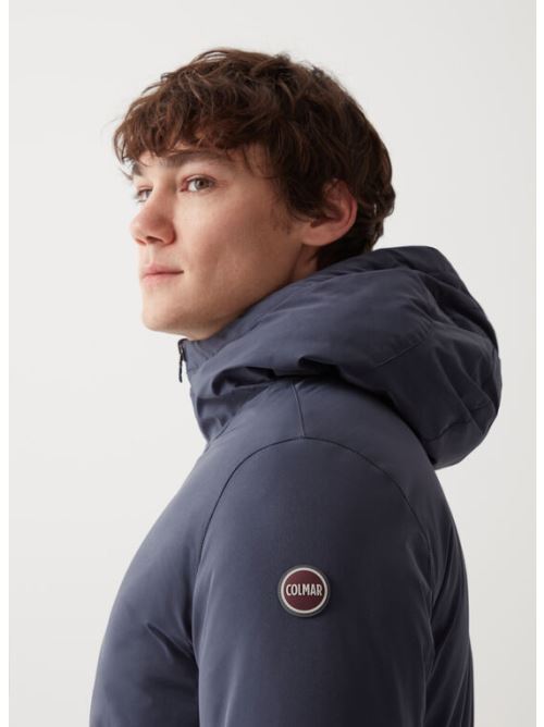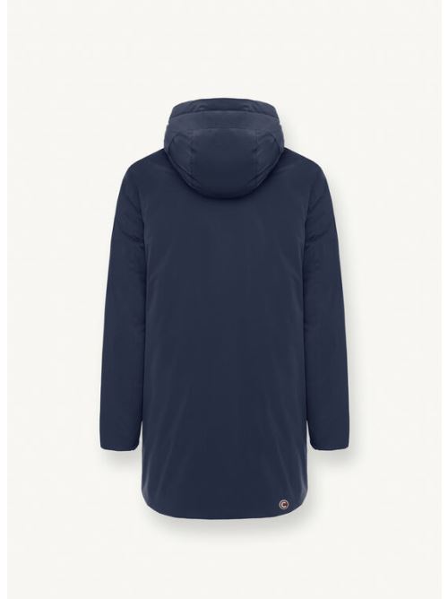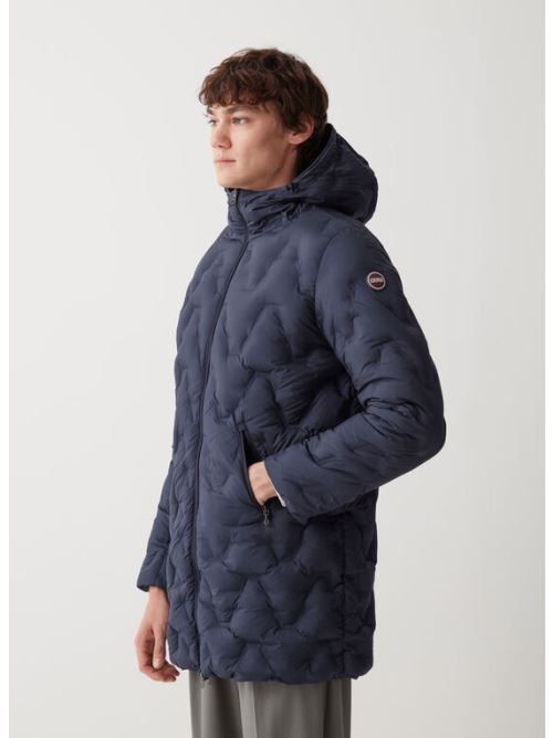 Giacca da uomo reversibile medio lunga con cappuccio fisso realizzata in tessuto stretch opaco con trattamento idrorepellente e impermeabile (5.000mm di colonna d'acqua) all'esterno e con tessuto con una costruzione particolare che non necessita di cuciture all'interno. Imbottita in piuma naturale. Pratico e confortevole, si presta ad usi diversi per diverse occasioni. Classica e rigorosa la parte liscia, creativa ed insolita la parte trapuntata. Un capo eclettico e polivalente per affrontare la stagione invernale.