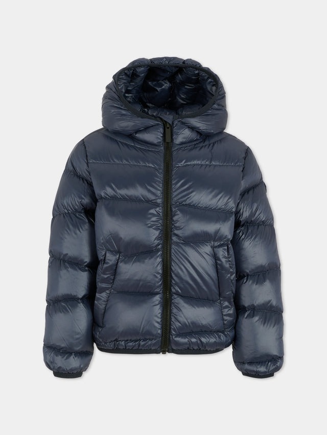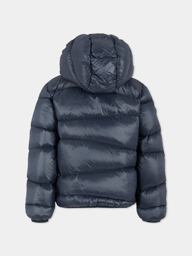 Piumino blu pesante, imbottito e trapuntato, a maniche lunghe, con cappuccio, chiusura frontale con zip, tasche laterali con zip, polsini e orlo elasticizzati. È decorato con patch logato, applicato sulla manica.