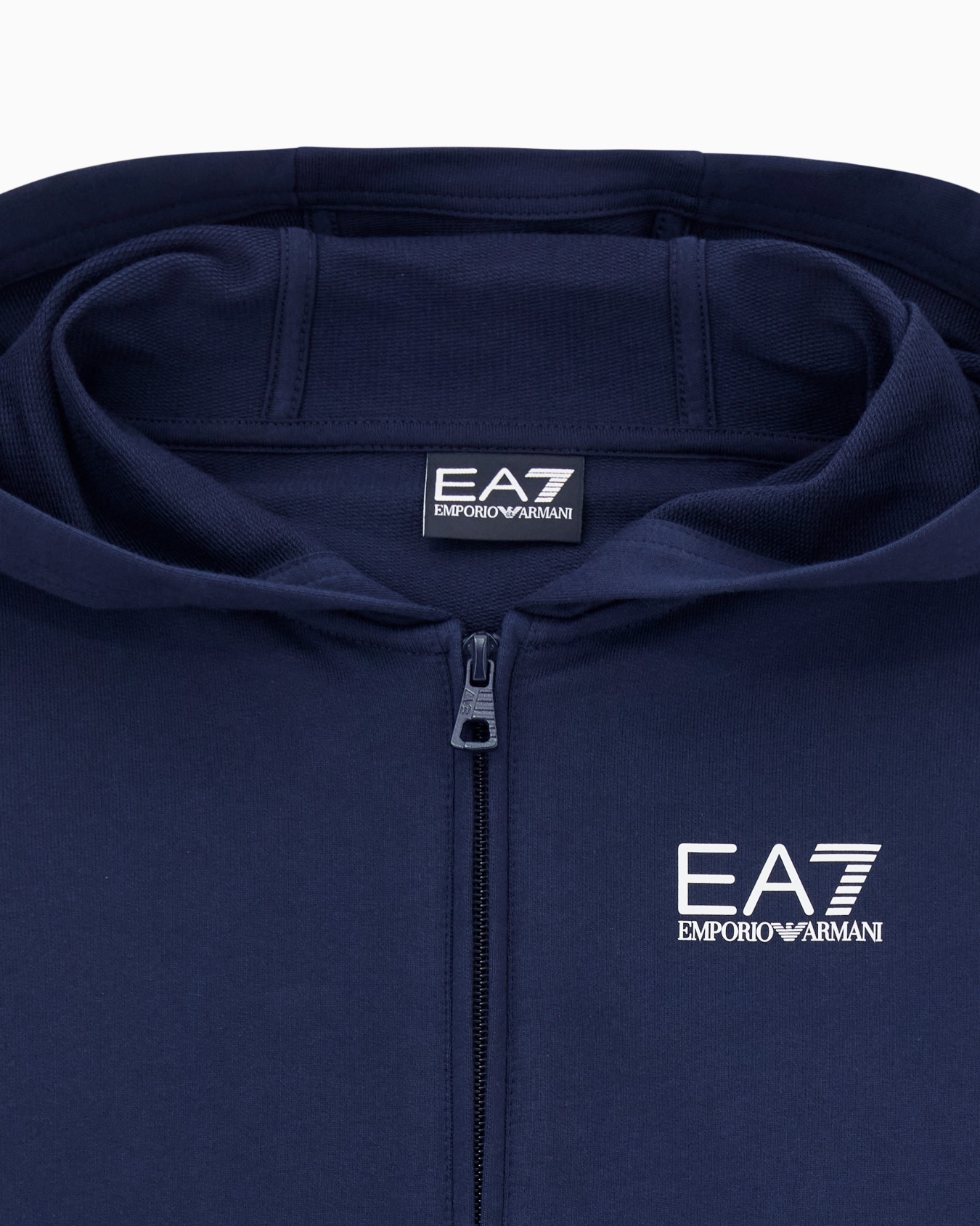 Felpa con cappuccio, chiusura con zip, due tasche laterali, logo EA7 a contrasto sul petto e dettagli in maglia elasticizzata
