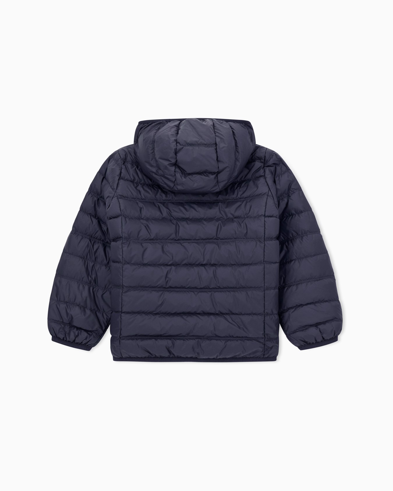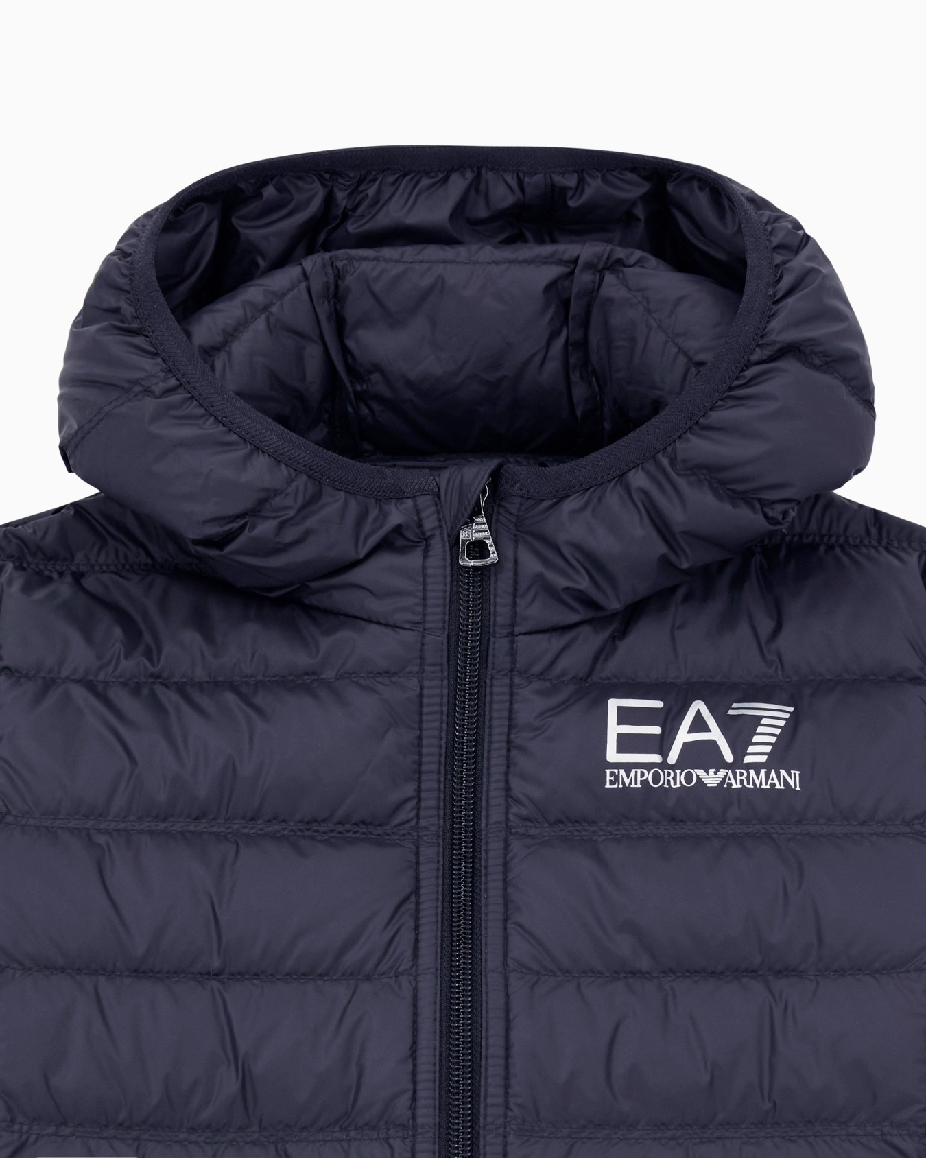 Questo piumino combina l'imbottitura in piuma d'oca con il tessuto tecnico per dar vita a un capo caldo e confortevole adatto ai più piccoli. Il modello è dotato di cappuccio fisso, chiusura frontale con zip, due pratiche tasche laterali ed è personalizzato dal logo EA7 a contrasto sul petto. Il capo è packable e può essere richiuso nella sua dust bag.