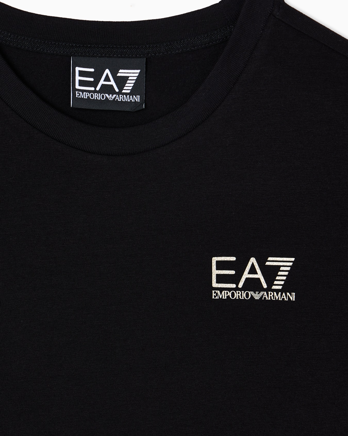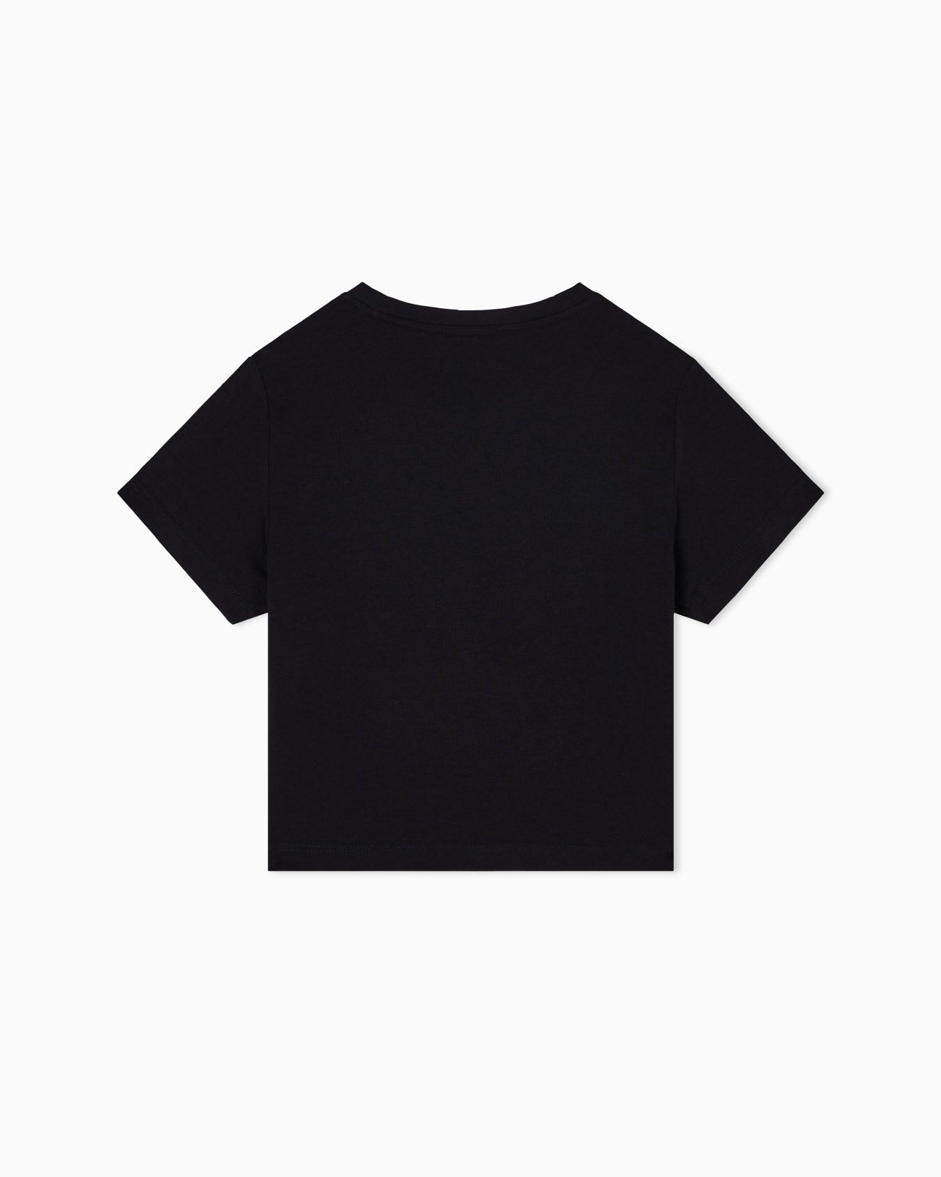 T-shirt girocollo essenziale e versatile, pensata per completare i look dedicati allo sport e al tempo libero. Il modello, realizzato in cotone stretch, è personalizzato dal logo EA7 a contrasto sul petto, che riprende altre creazioni della proposta Logo Series dedicata alle più piccole.