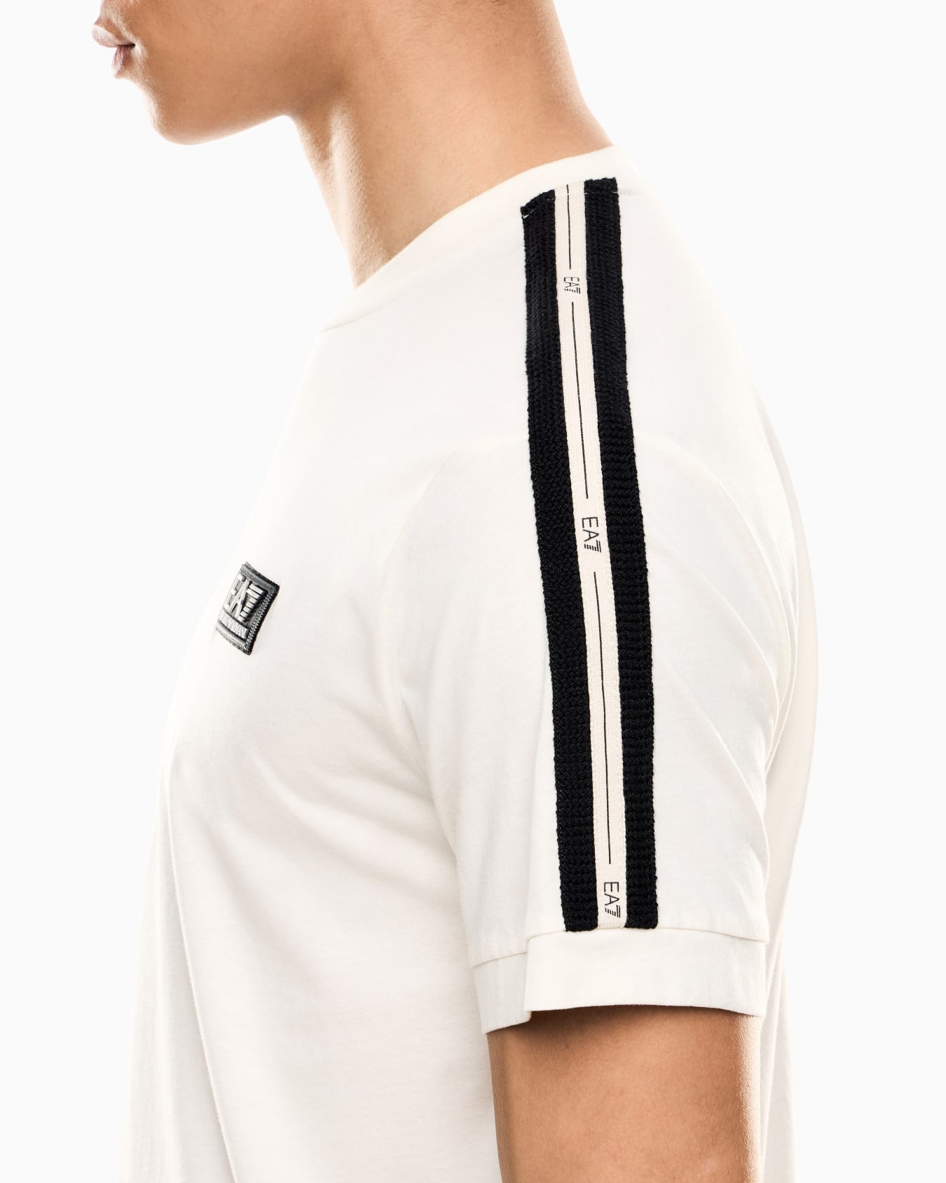 T-shirt girocollo realizzata in morbido jersey di cotone, dalla vestibilità regular. Il modello è personalizzato dal dettaglio con logo tape sulle spalle e dal logo EA7 sul petto, che riprende altri creazioni della linea Logo Series.
