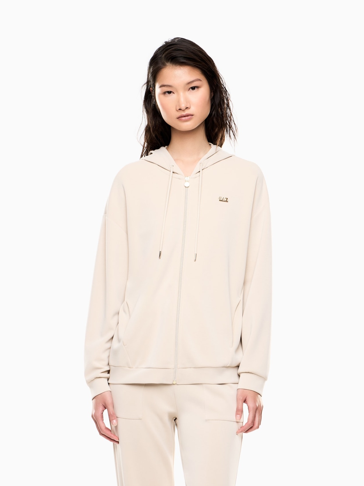 Linee essenziali e pulite per questa felpa con cappuccio e chiusura con zip caratterizzata dal logo charm con finitura oro sul petto. Un modello femminile, dotato di due pratiche tasche laterali e realizzato in misto modal stretch, ideale per assicurarti comfort sia durante le tue sessioni di allenamento sia nei momenti di relax. Perfetto da abbinare ai pantaloni di collezione per creare total look versatili e di tendenza.