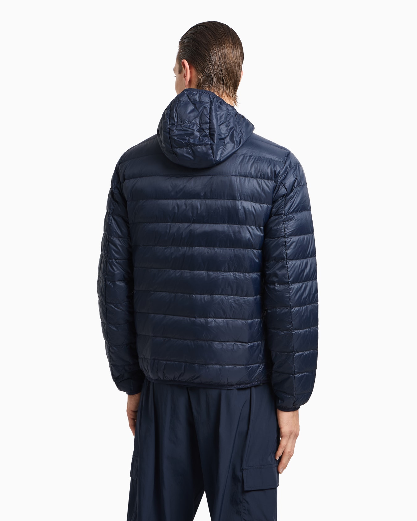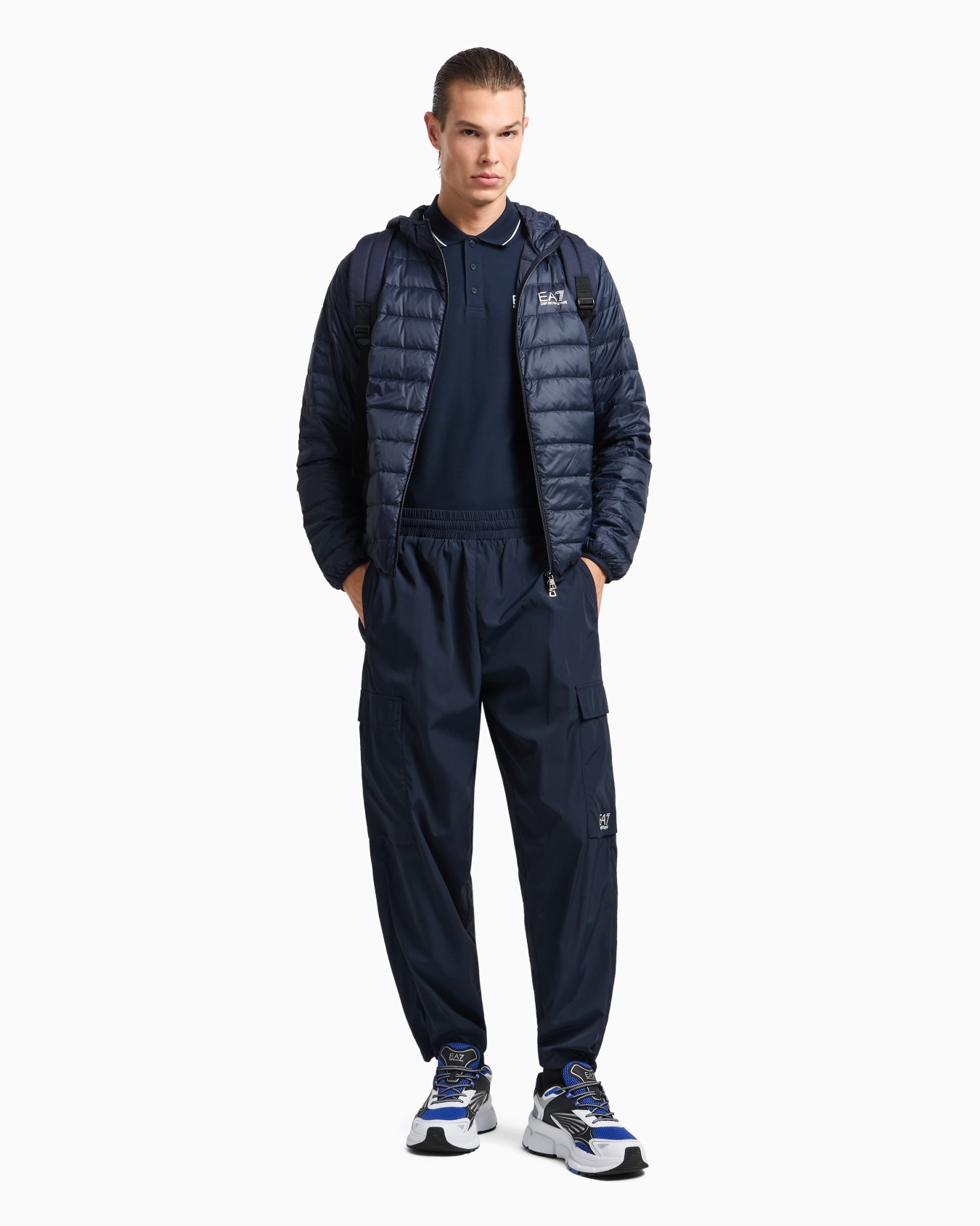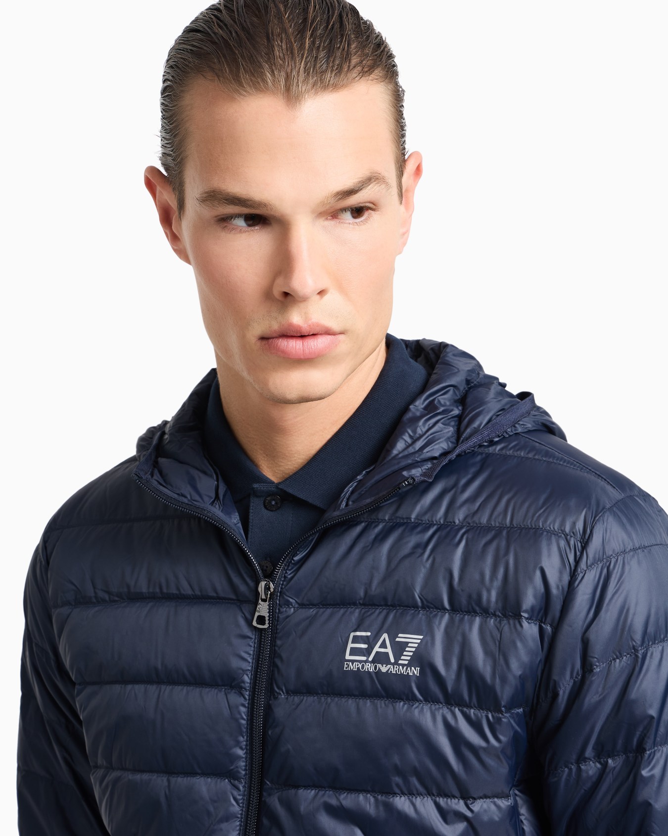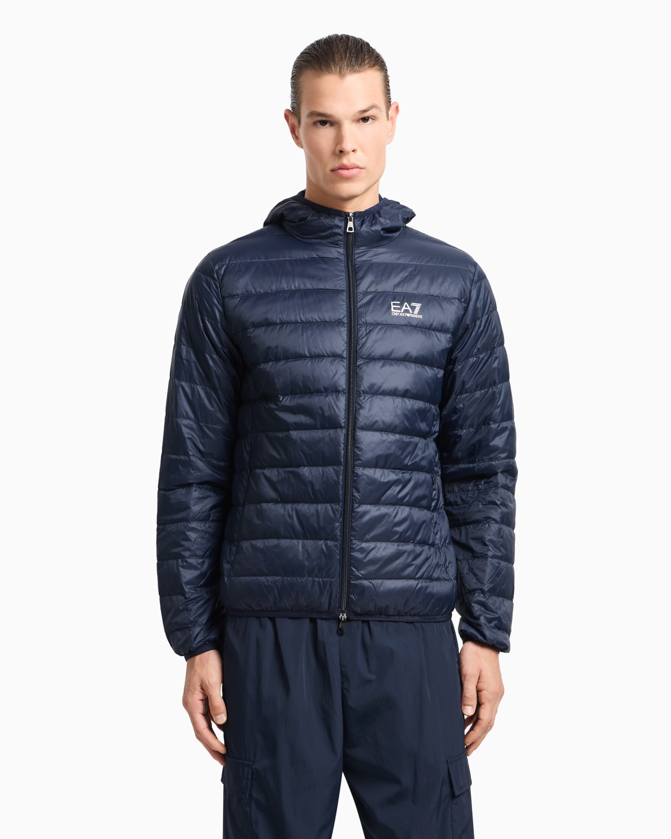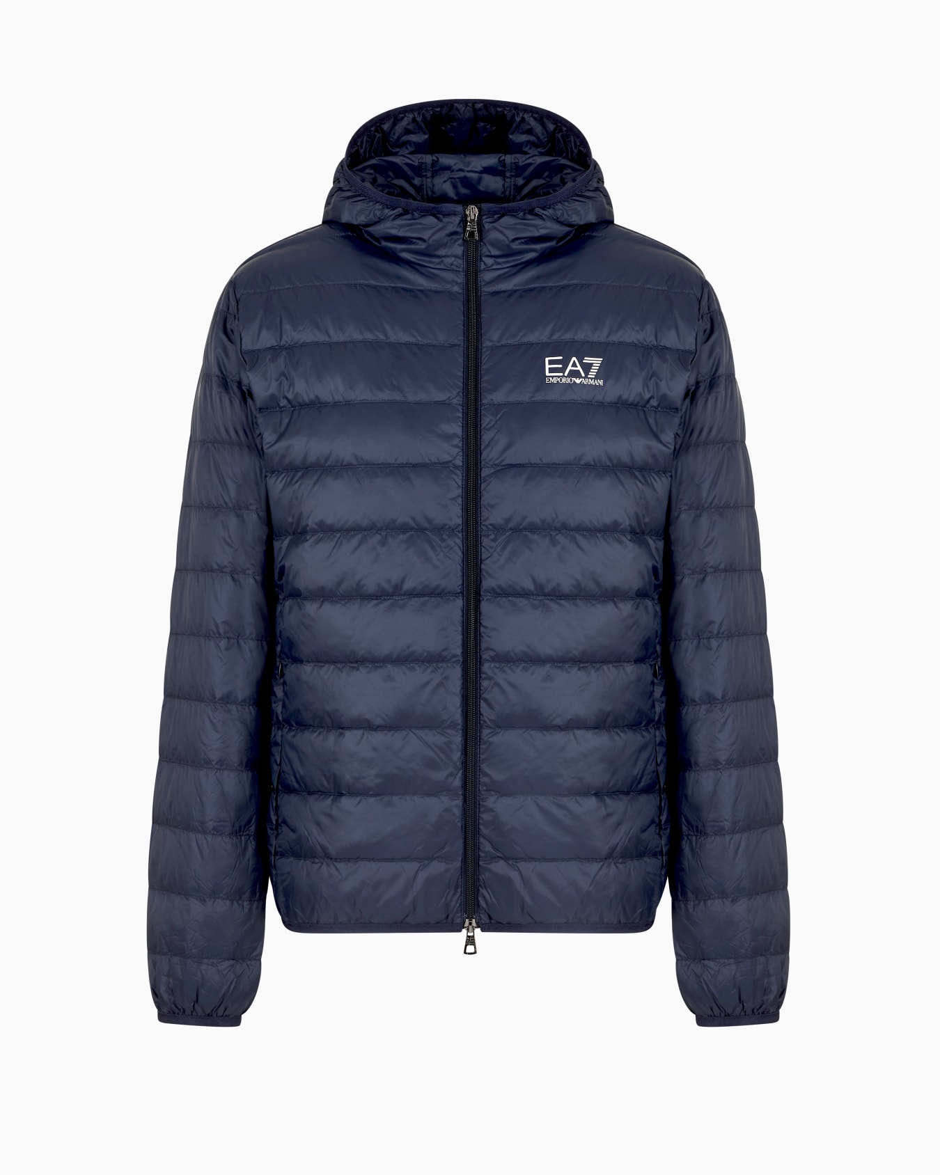 Questo piumino combina l'imbottitura in piuma d'oca con il tessuto tecnico per dar vita a un capo caldo e confortevole. Il modello è dotato di chiusura frontale con zip, cappuccio fisso, due pratiche tasche laterali ed è personalizzato dal logo EA7 a contrasto sul petto. Il capo è packable e può essere richiuso nella sua dust bag.