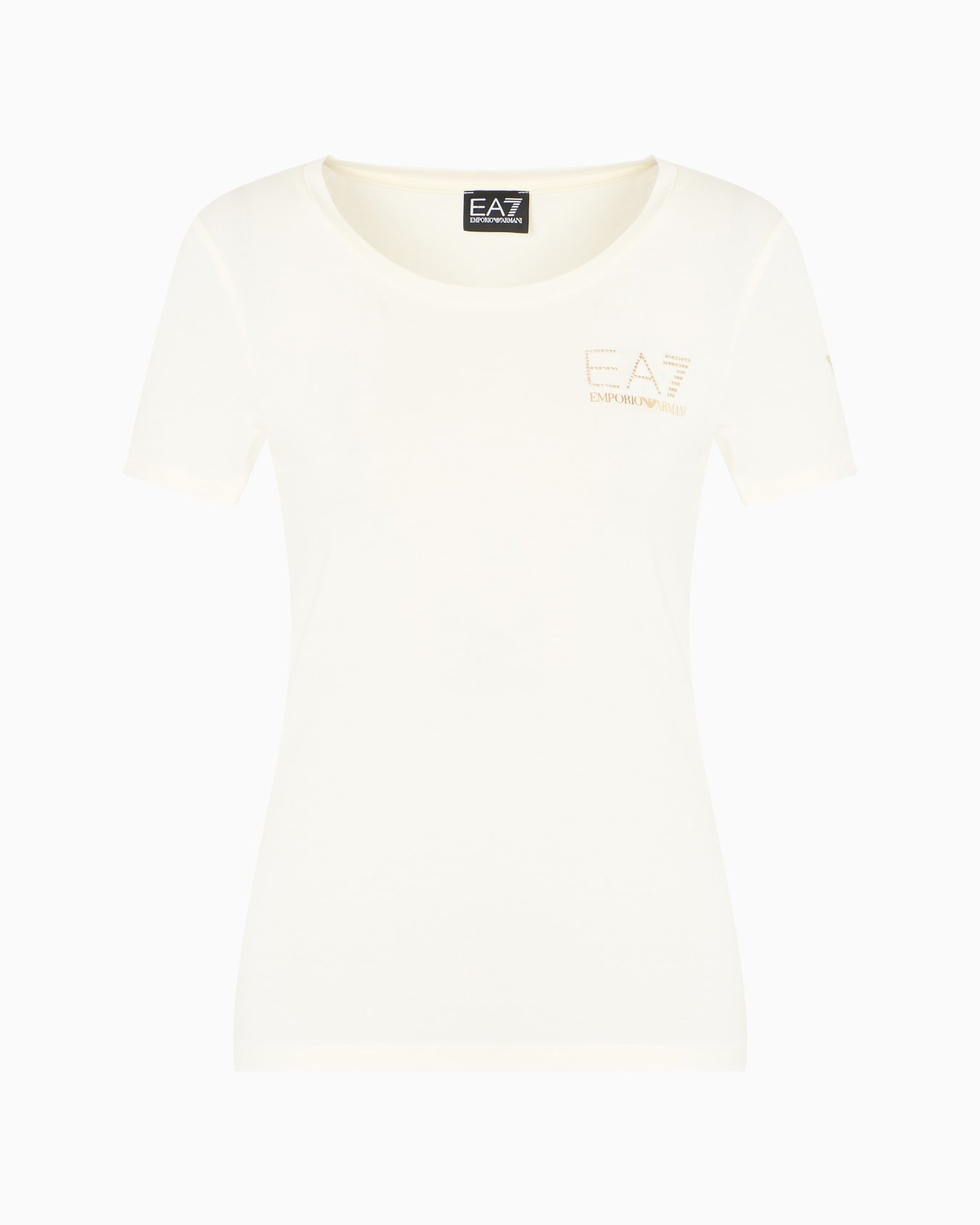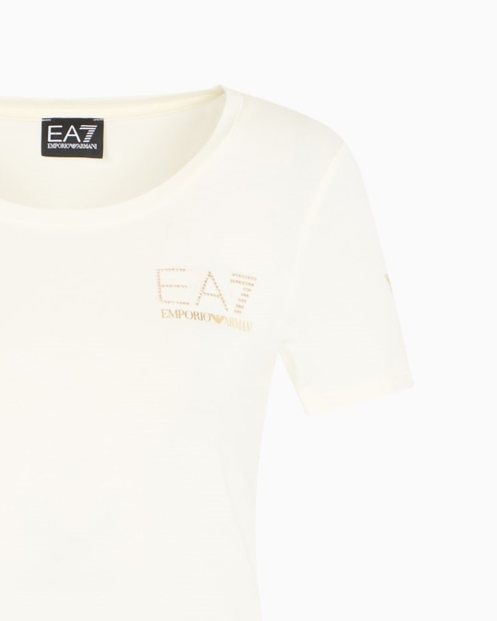 T-shirt girocollo versatile e comoda, realizzata in tessuto misto cotone e modal stretch, dalla vestibilità slim, pensata per completare il tuo look sporty con un tocco luminoso. Un modello che si distingue per la personalizzazione del logo EA7 sul petto e dal logo Eagle sulla manica sinistra, entrambi realizzati in micro borchie oro che donano un tocco luminoso, che richiama sia i pantaloni che le felpe della stessa linea.