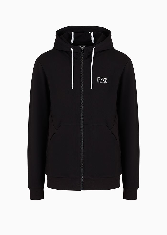 Felpa con cappuccio realizzata in morbido cotone, che conquista per la sua attitude versatile e urbana, sottolineata anche dalla vestibilità regular. Il modello, personalizzato dal maxi logo EA7 a contrasto sulla schiena, si presta a completare outfit dedicati allo sport e il tempo libero, in abbinamento ai pantaloni e t-shirt di collezione.