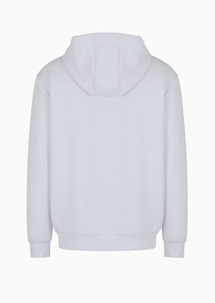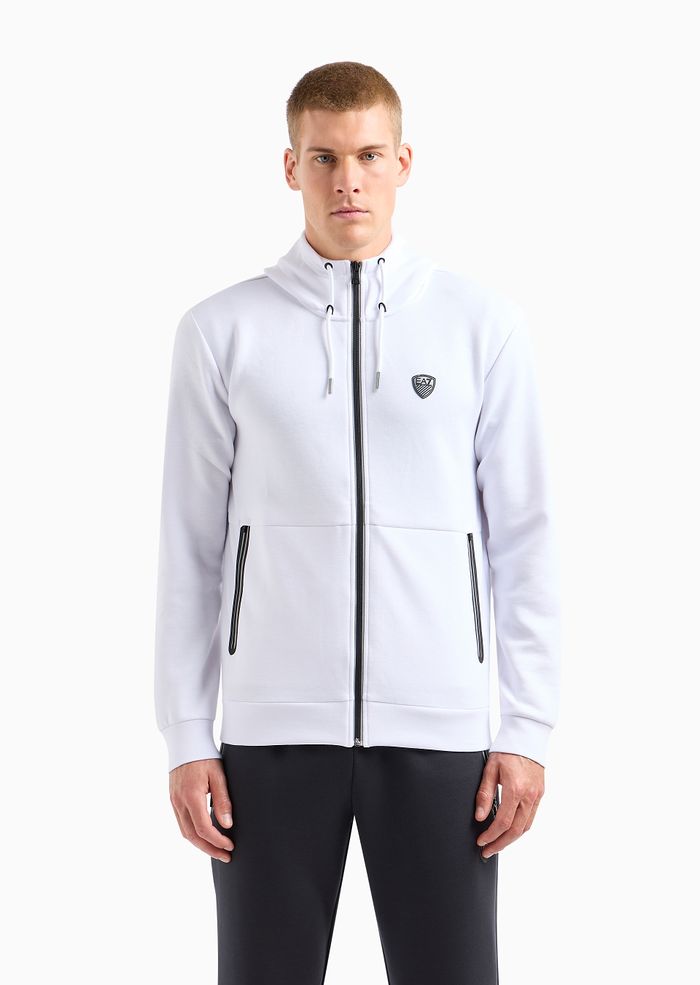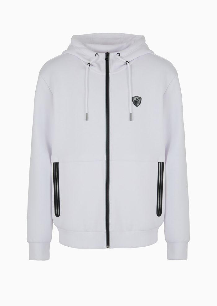 Felpa con cappuccio realizzata in misto viscosa stretch, dalla vestibilità confortevole. Il modello presenta apertura con zip, due tasche laterali zippate e una personalizzazione con patch scudetto applicato sul petto. Un capo versatile ed essenziale, complemento ideale di numerosi look in chiave sportiva.