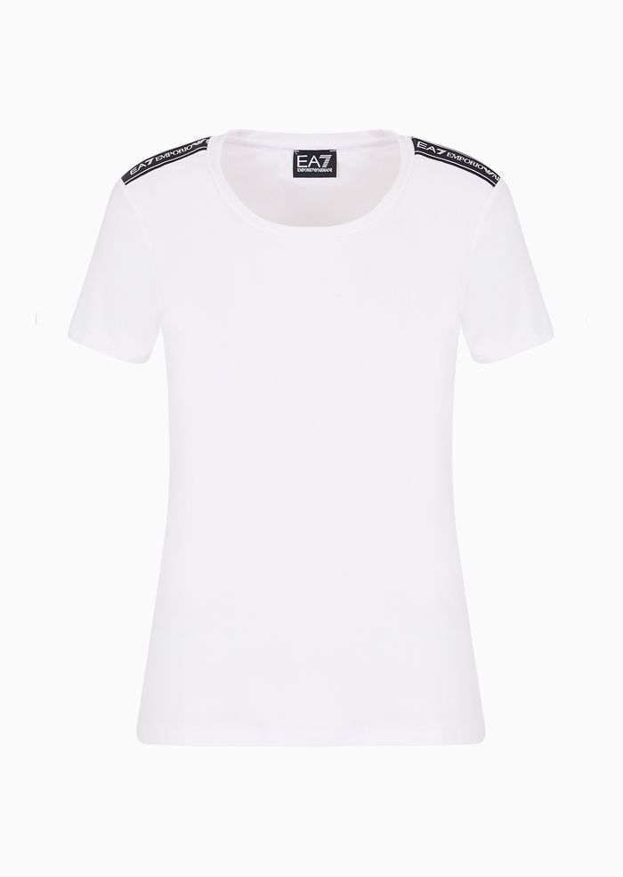 T-shirt girocollo, realizzata in misto cotone organico, pensata per garantire il massimo comfort durante gli allenamenti. Caratterizzata da un design essenziale, è impreziosita dal dettaglio con logo tape sulle spalle e dall'inconfondibile logo EA7 sul petto.