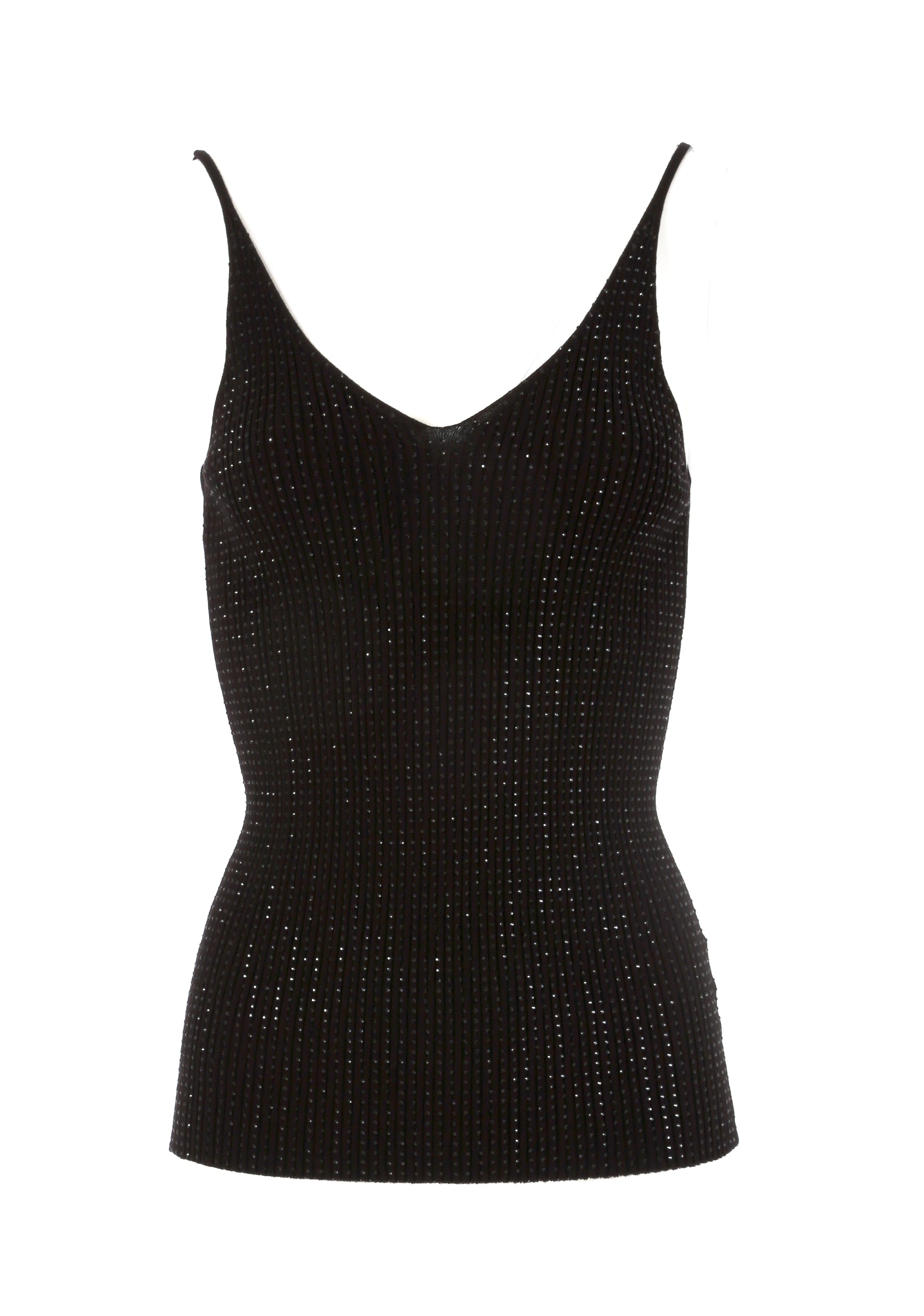 Top slim senza maniche con strass luminosi, e con scollo a V.