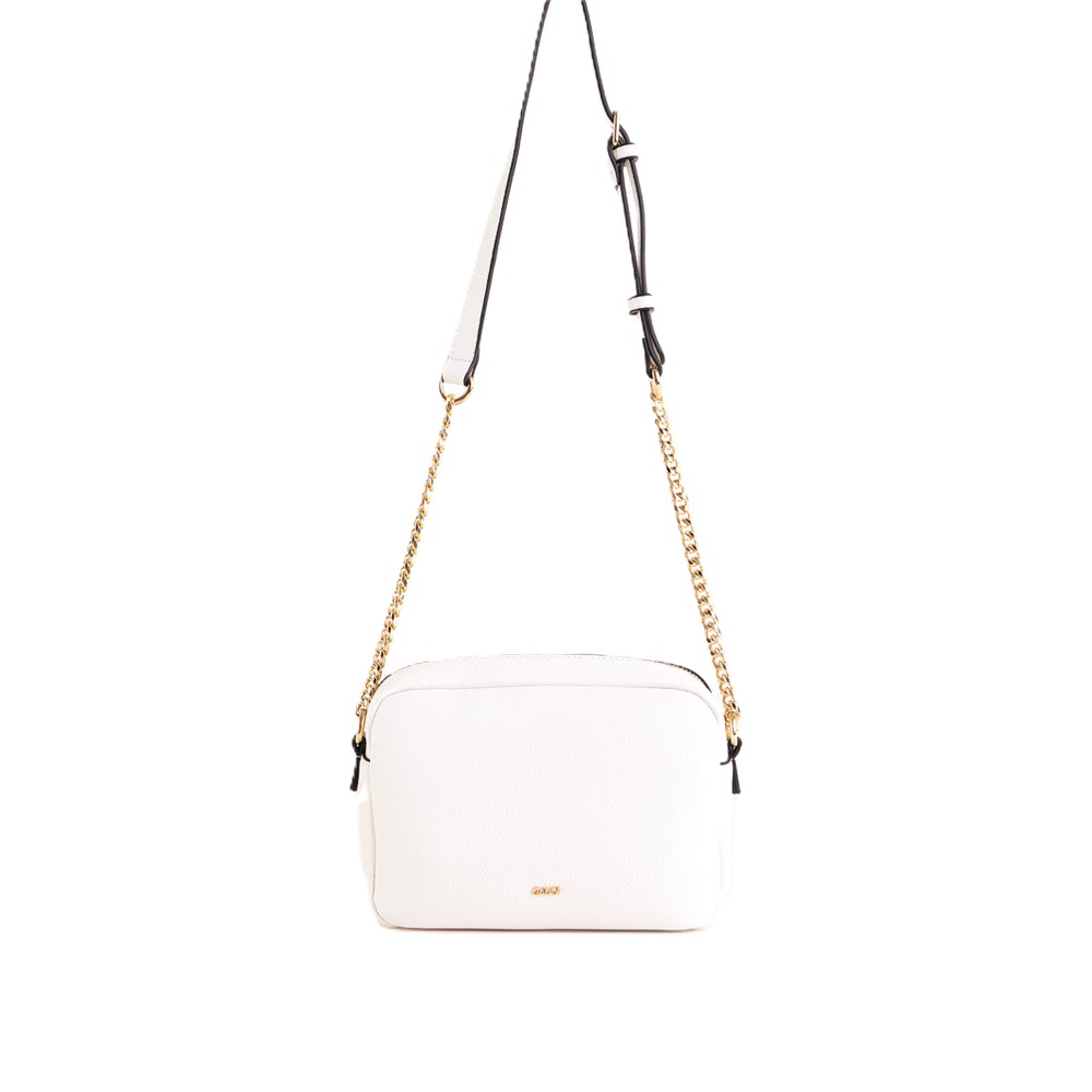 Borsa crossbody similpelle con loghi GJ in metallo dorato, tracolla a catena regolabile e non rimovibile. Per un look elegante e glamour.