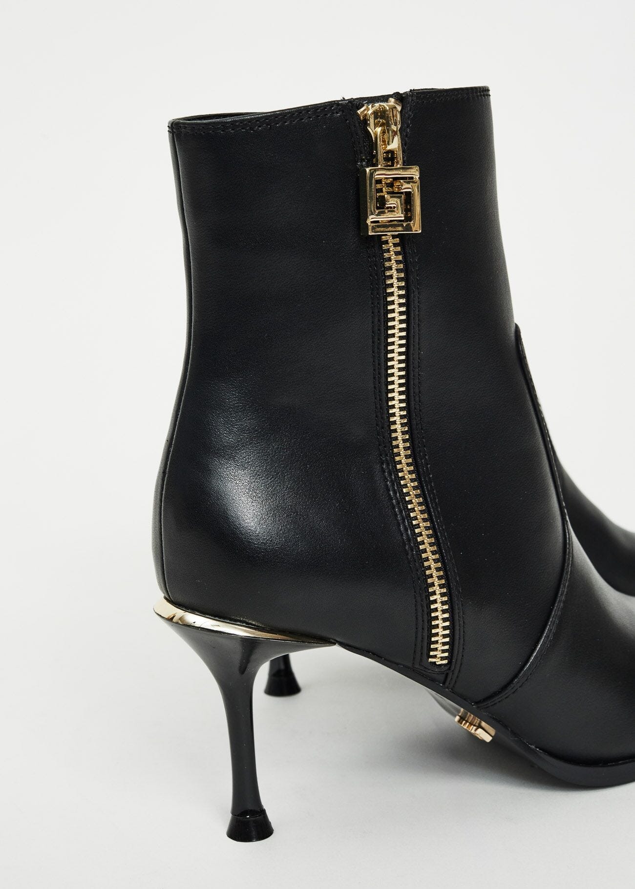 Scegli gli stivaletti in similpelle con tirazip logata, finiture in metallo dorato e tacco stiletto. Per un outfit che unisce grinta e raffinatezza. Altezza tacco: 8 cm