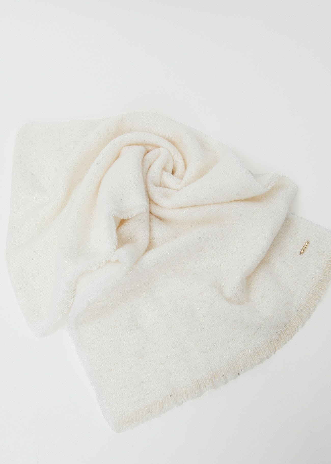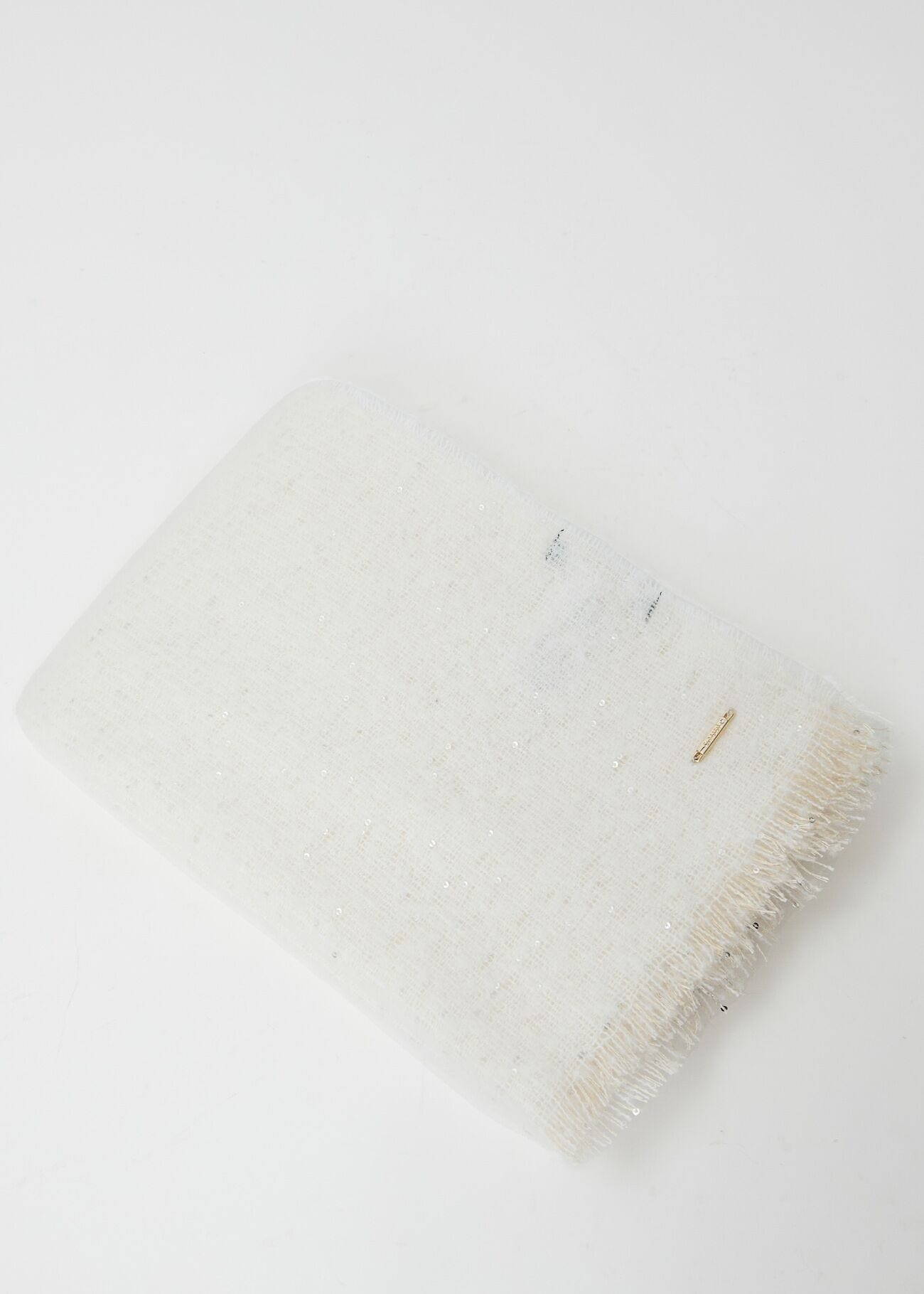 Scegli la sciarpa in morbido filato con paillettes, bordi sfrangiati e logo in metallo. Avvolgente e scintillante per un outfit invernale luminoso.