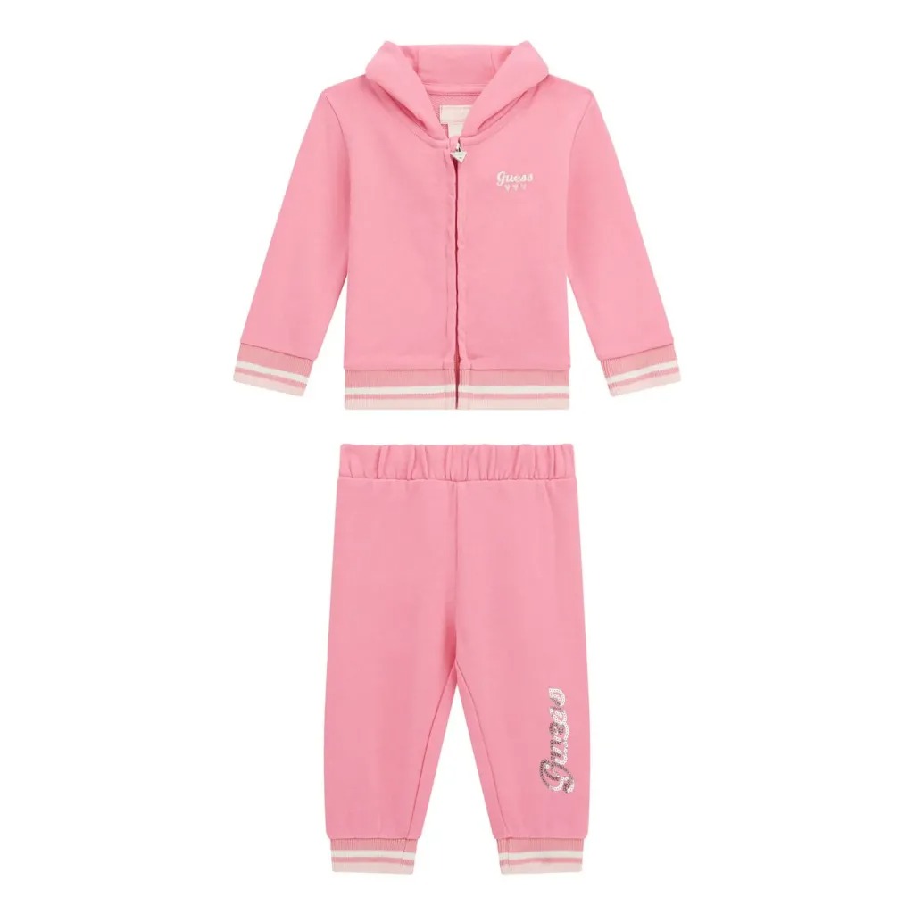 Completo sportivo rosa per neonata con cappuccio e scritta Guess con paillettes. Design accattivante con felpa con zip e piccola scritta ricamata. Pantaloni sportivi con scritta Guess su una gamba. Il design rosa aggiunge femminilità e stile, mentre la scritta del marchio Guess conferisce un look moderno. Questo completo sportivo è la combinazione perfetta di comfort, stile e qualità per ogni bambina che ama le attività sportive e la moda.