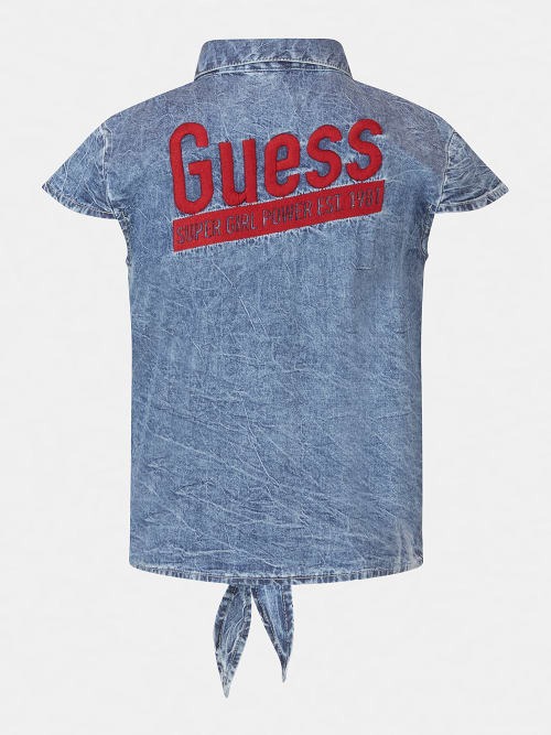 Camicia Guess in jeans, chiusura a bottoni, stampa lettering sul retro.