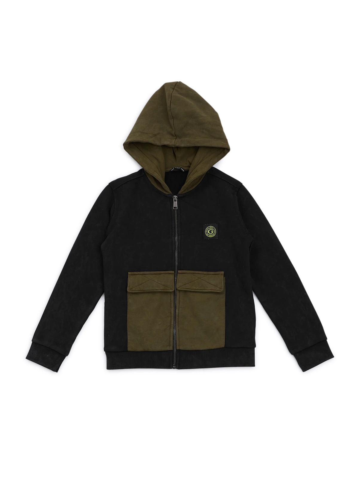 Felpa con cappuccio con design color block, tasche frontali con patta e chiusura con zip.