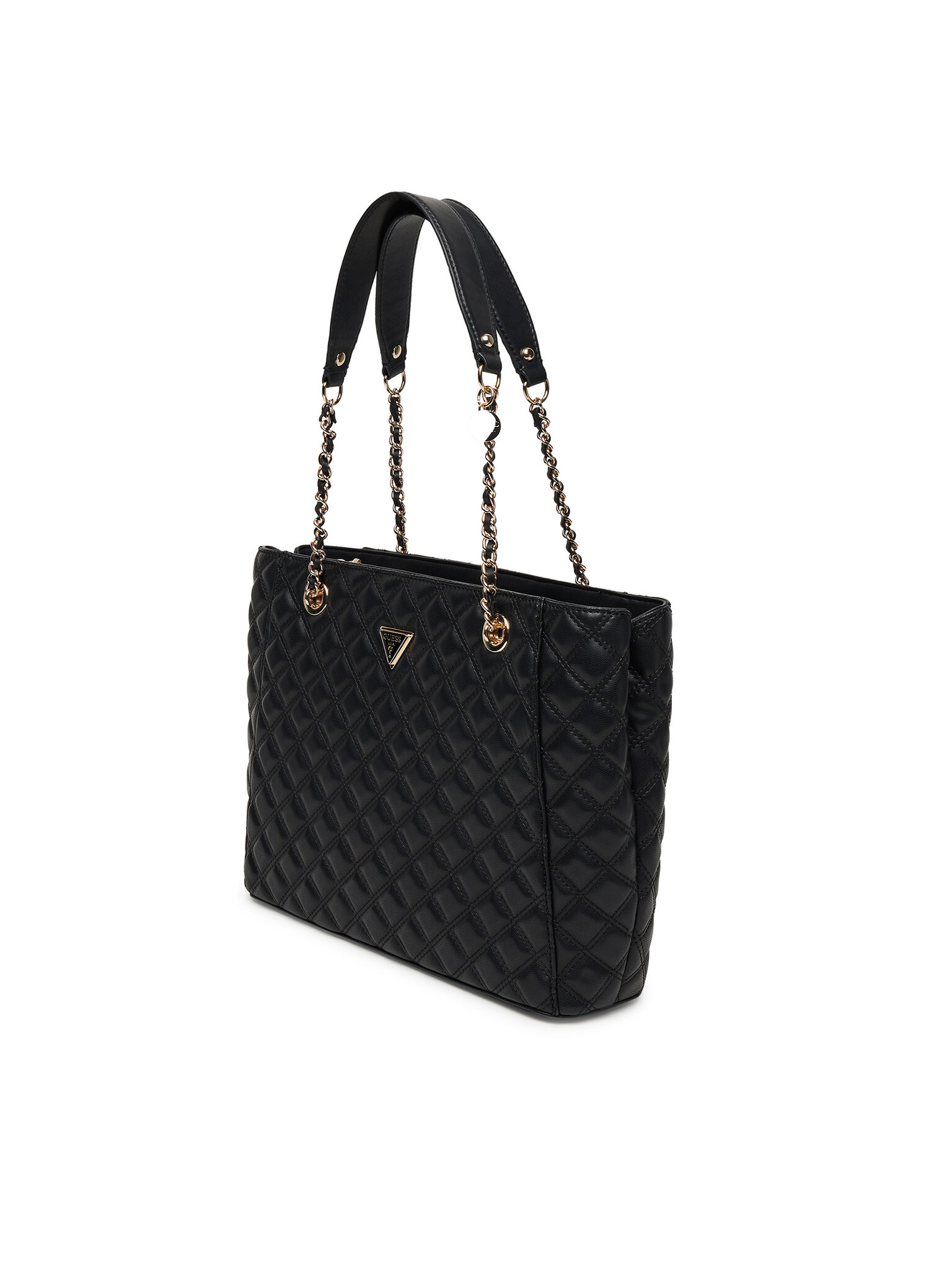 Questa splendida borsa Guess di grandi dimensioni si chiude con una cerniera e presenta dettagli dorati. Sul davanti si trova un elegante logo Guess a forma di triangolo.