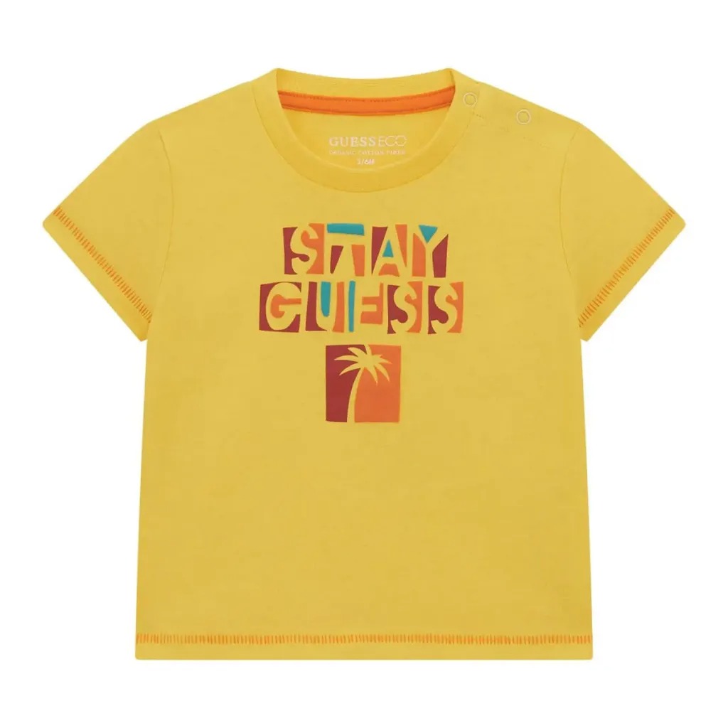 La maglietta bianca per neonato con la scritta "Stay Guess" giallo-turchese è un capo comodo ed elegante per le piccole icone della moda. Realizzata con materiali di alta qualità, questa maglietta offre al tuo bambino il massimo comfort per tutto il giorno. Le scritte dai colori vivaci aggiungono un tocco giocoso e moderno all'abbigliamento del neonato. Ideale per le attività sportive o le passeggiate quotidiane, questa maglietta è l'aggiunta perfetta al guardaroba del tuo bambino.