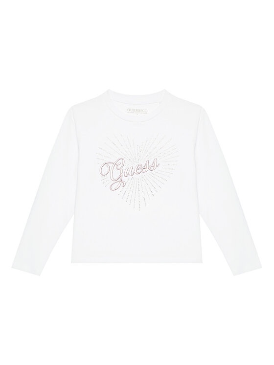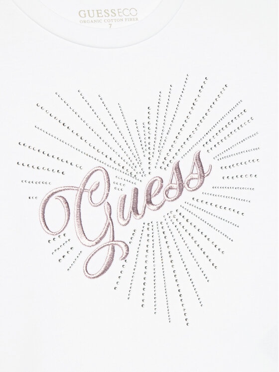 * Stampa frontale con logo GUESS e cuore decorato da strass