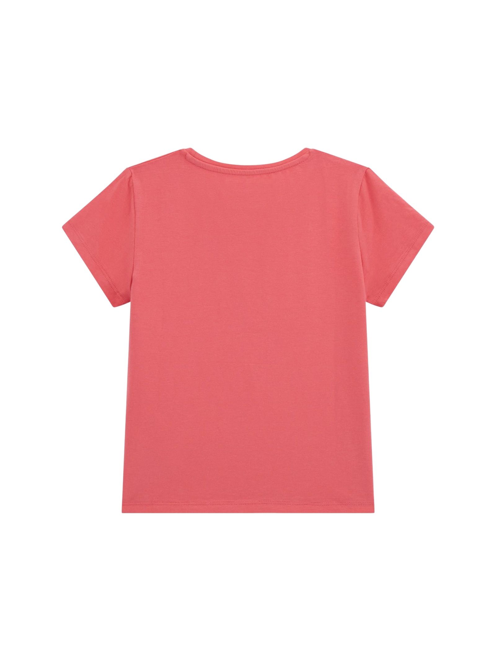 T-Shirt Guess, colore rosa corallo, girocollo, stampa tropicale nei toni del rosa con palme, logo Guess Est. 1981, che richiama l'estetica rilassata di Los Angeles.