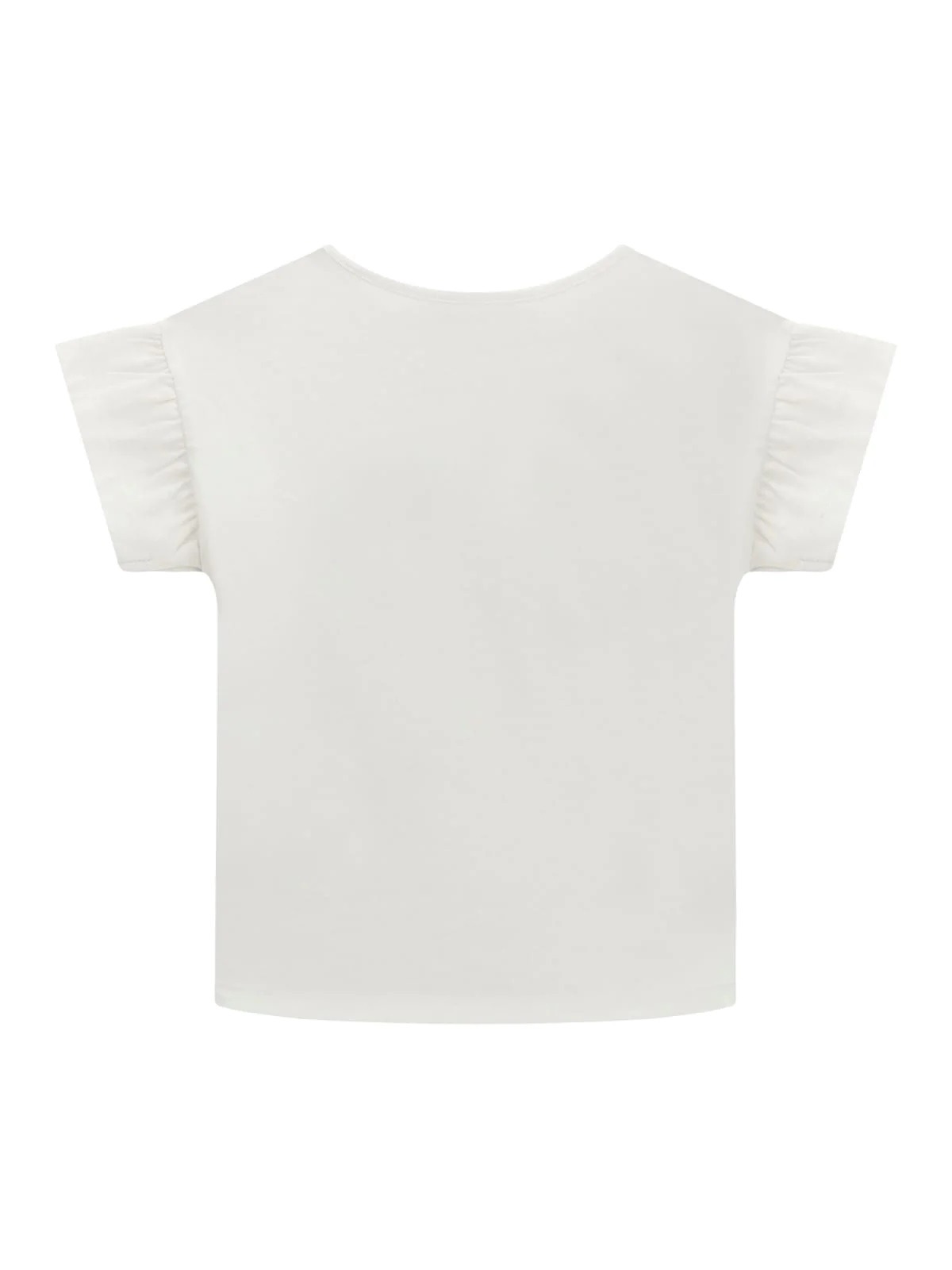 T-shirt Guess, modello girocollo e mezze maniche con volant; riquadro con logo lettering e paillettes sul davanti incorniciato da fantasia floreale.